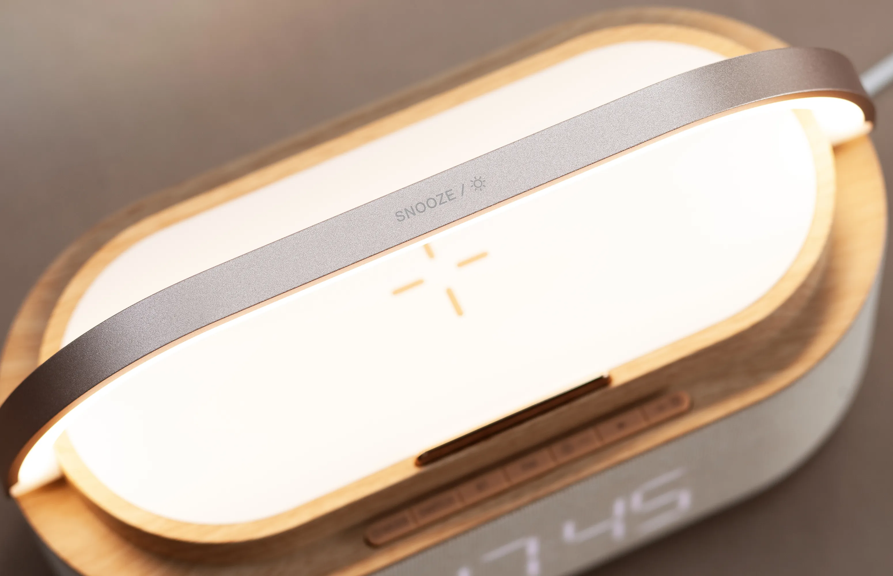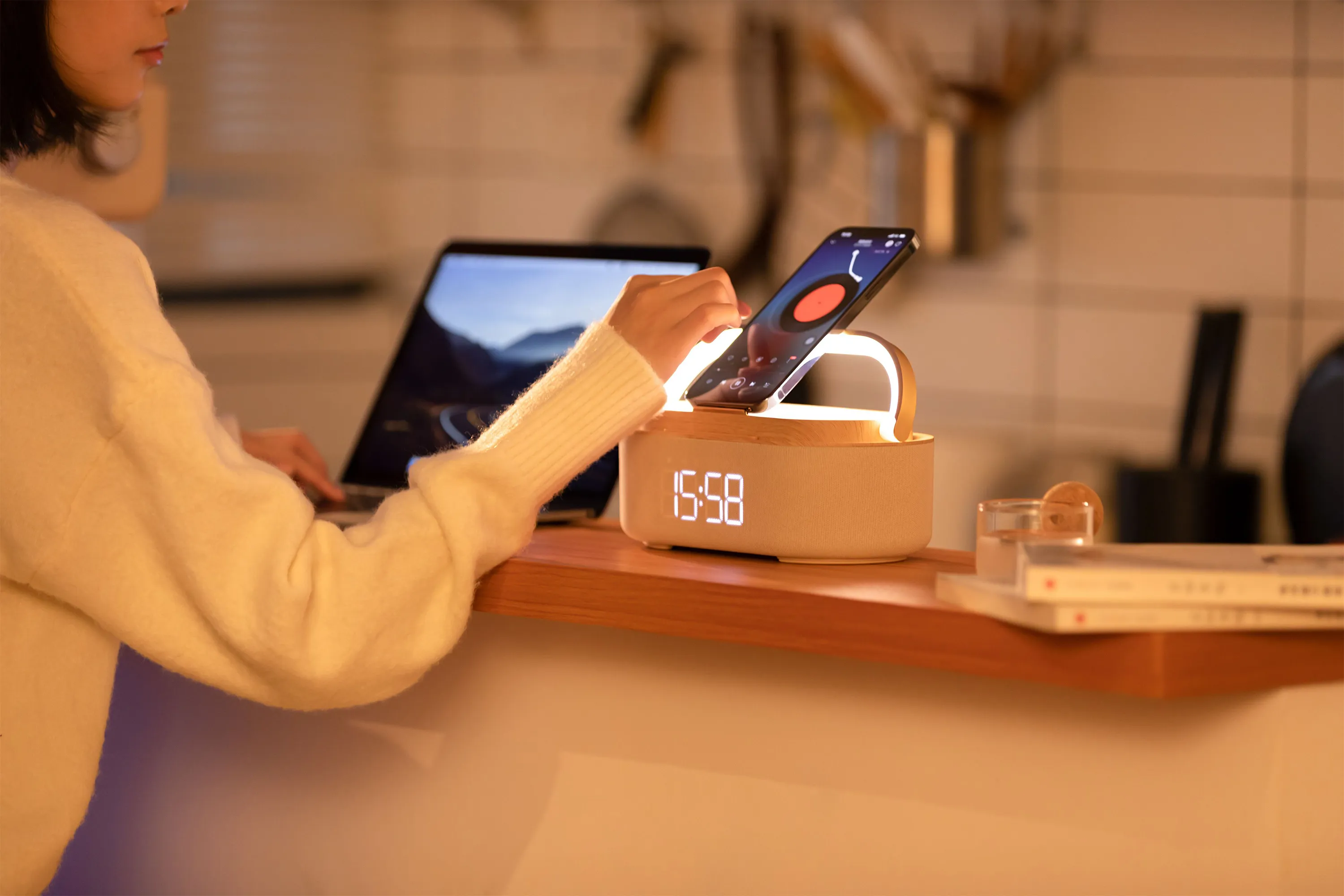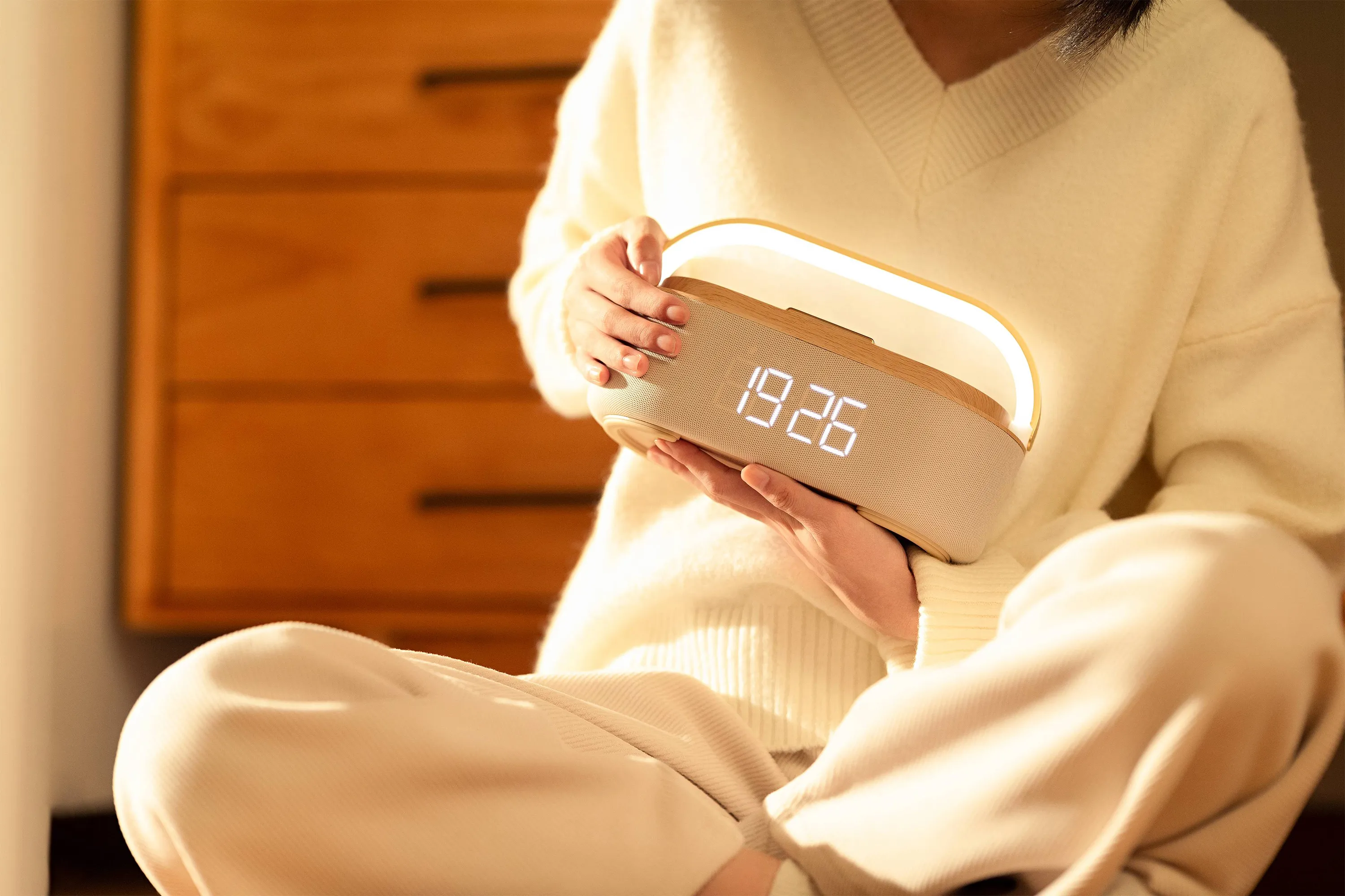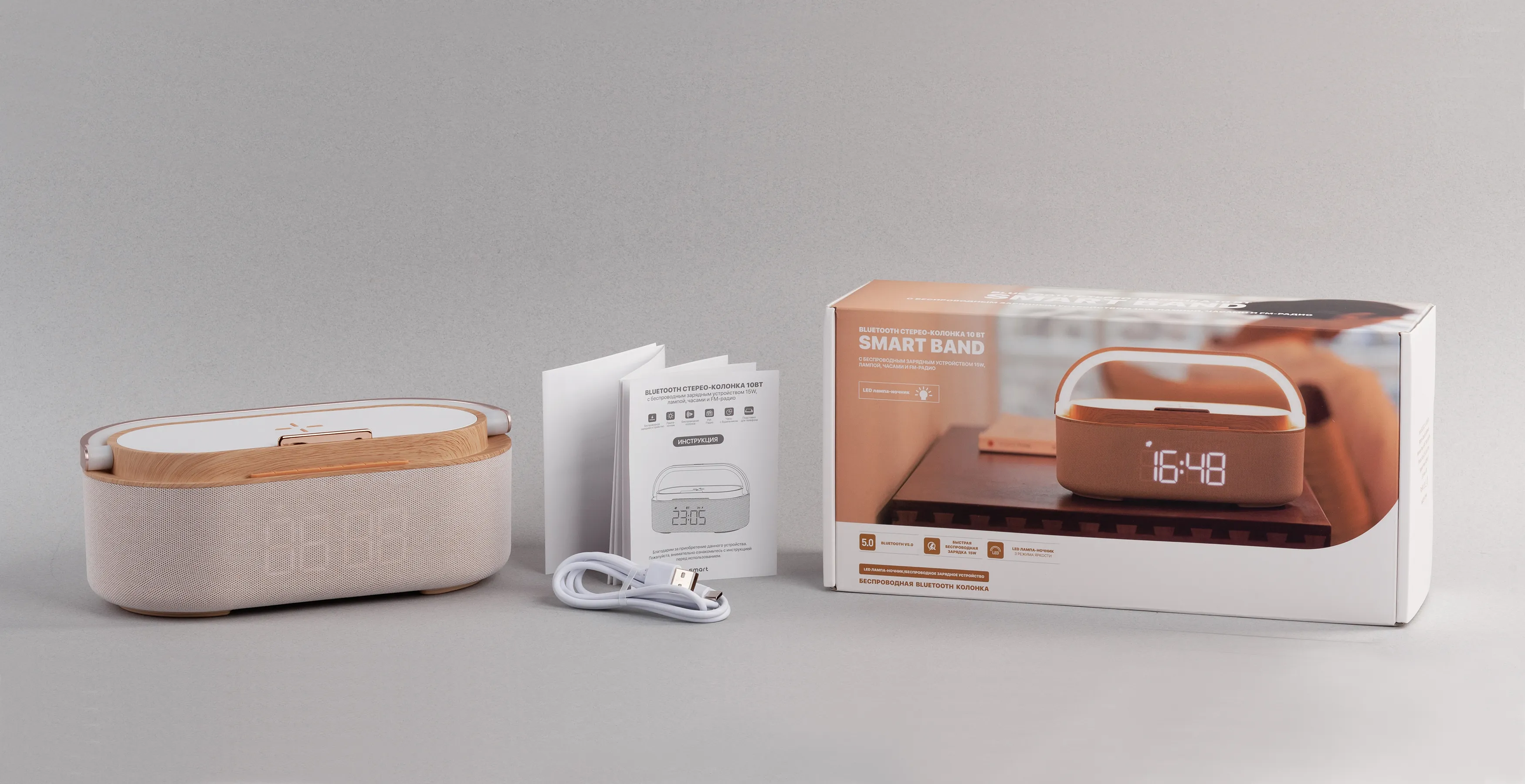 Bluetooth стерео-колонка "Smart Band" 10Вт (2х5Вт) с беспроводным (15W) ЗУ, лампой, часами, FM радио бежевый