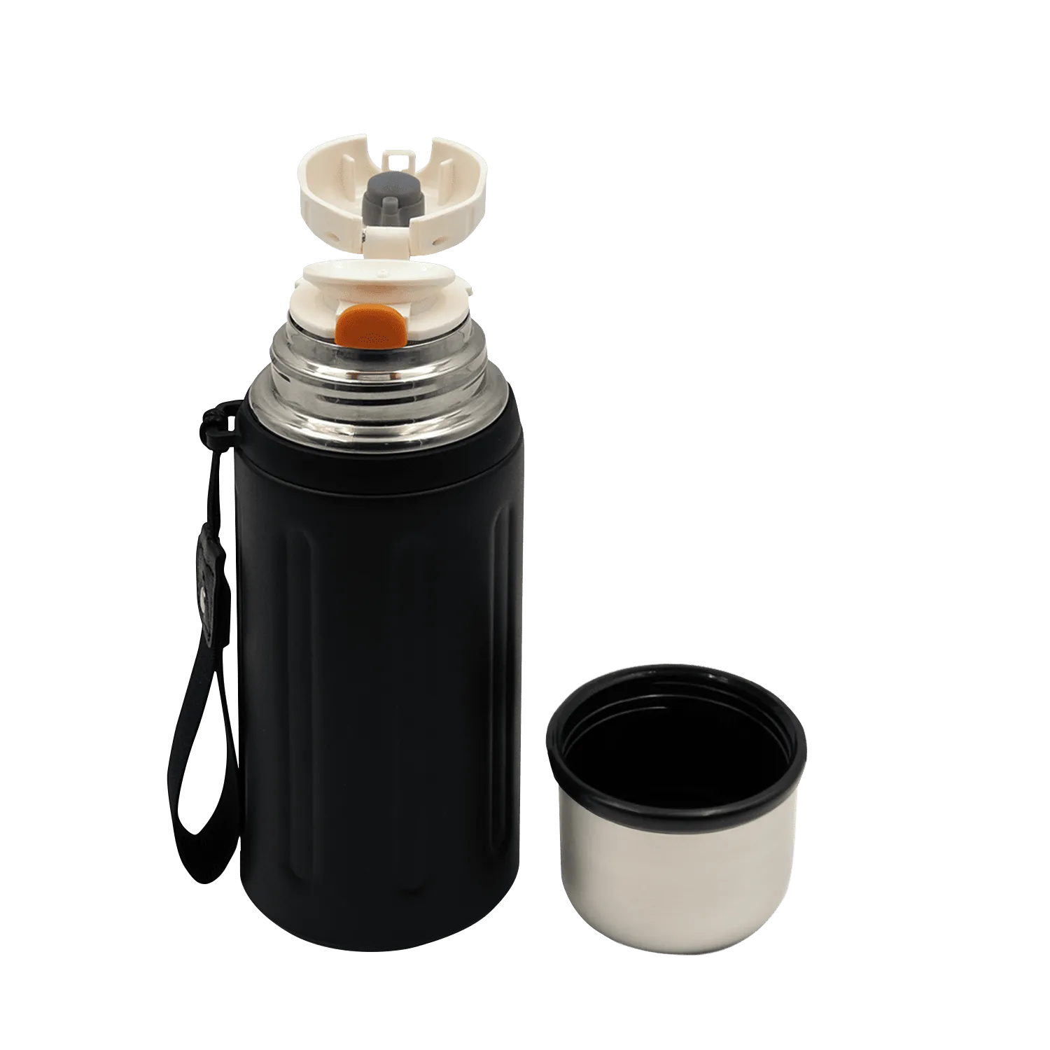 Объем в 600 мл позволит взять с собой достаточно напитка, будь то горячий кофе, ароматный чай или освежающий холодный сок. Крышка термоса является важной частью функциональности и удобства использования. Она состоит из двух частей: крышки-чашки и крышки с клапаном. Обе они имеют завинчивающийся механизм, который обеспечивает надежную герметичность. Крышка-чашка имеет емкость 100мл и предназначена для самостоятельного питья: в нее удобно наливать напиток и держать в руках. Съемный ремешок термоса сделает переноску удобной и комфортной.