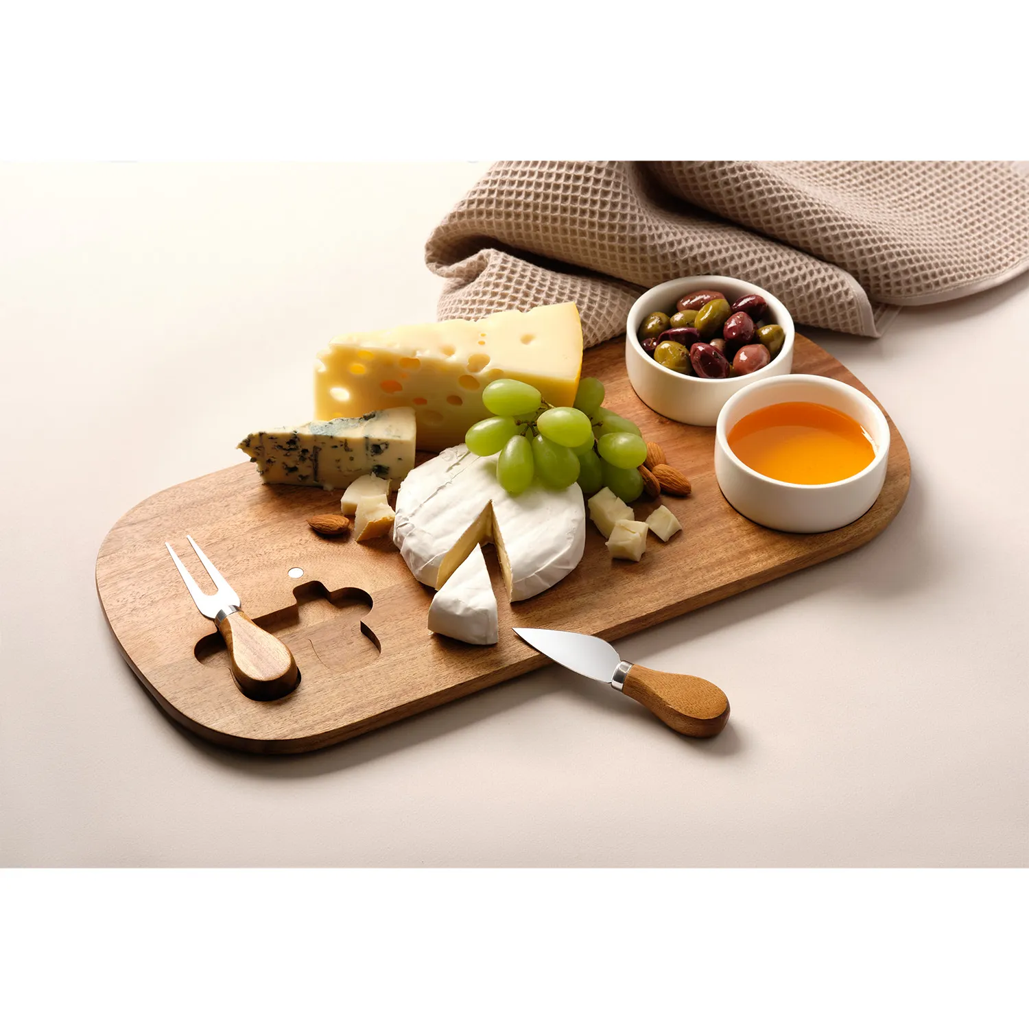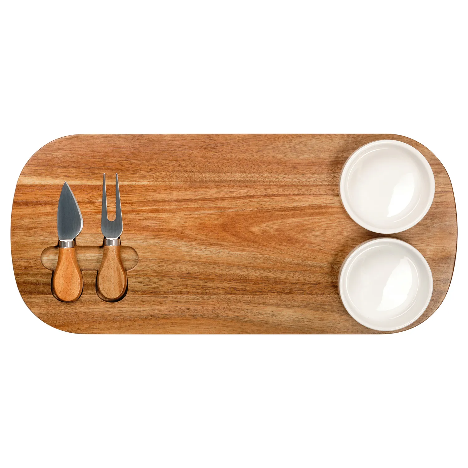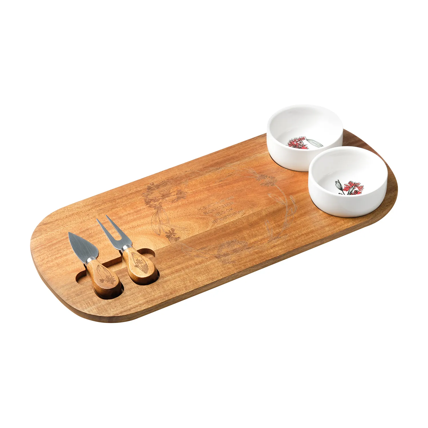 Набор предназначен для сервировки сыров и других закусок, а керамические соусницы идеально подойдут для меда, варенья или орехов.