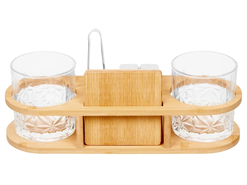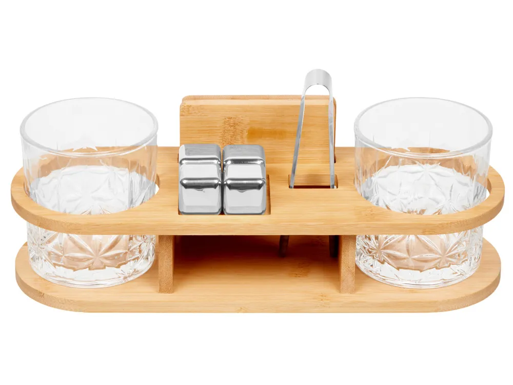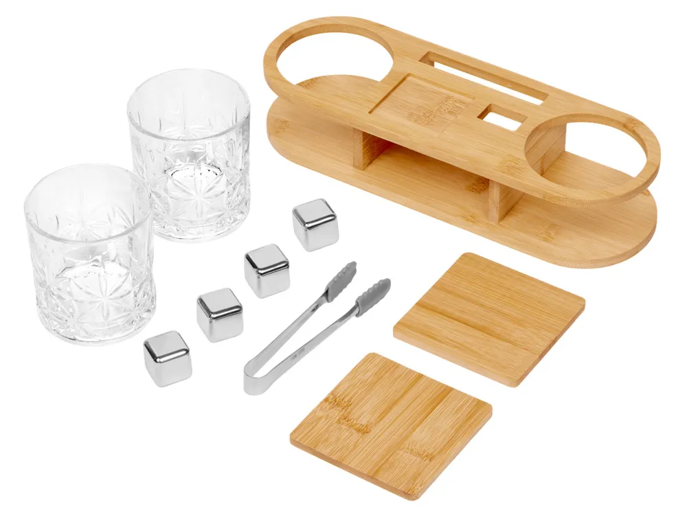 Набор для виски на бамбуковой подставке "Boulevardier" достаточно практичен - он состоит из 10 предметов, которые позволят правильно сервировать виски или какой-либо другой напиток. Все элементы набора компактно размещены на специальной подставке из бамбука, в которой для каждого предмета есть свое место — это позволяет экономить место на кухне или в столовой. Бокалы для виски (2 шт.) — изготовлены из ударопрочного боросиликатного стекла, на стенках бокалов - узор, который позволит напитку заиграть по-новому. Подставки для бокалов (2 шт.) — костеры из бамбука защитят стол и дно бокалов от царапин и капель напитка, обеспечив бесшумность при использовании. Кубики из нержавеющей стали (4 шт.) — металлические кубики, содержащие запаянную внутри смесь воды и глицерина, помогут быстро охладить виски. В отличие от ледяных кубиков, металлические не будут разбавлять напиток по мере нагрева, сохраняя истинный вкус. Щипцы для кубиков (1 шт.). Подставка (1 шт.),на которой компактно размещены все предметы набора. Выполнена из бамбука. - прочные и долговечные материалы; - подставка для удобного хранения; - объём одного бокала 350 мл; - бокалы можно мыть в посудомойке; - готовый сет для подарка.