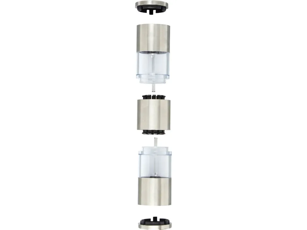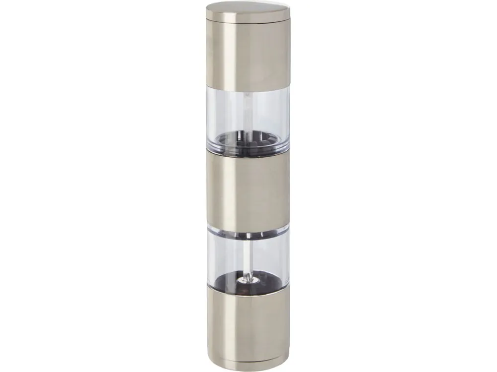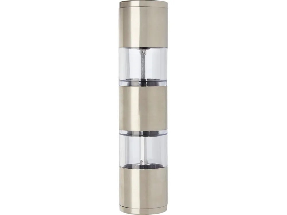 Двусторонняя мельница с одной стороной для соли, а второй для перца. Перец и соль в комплект не входят. Нержавеющая сталь, пластик PS.