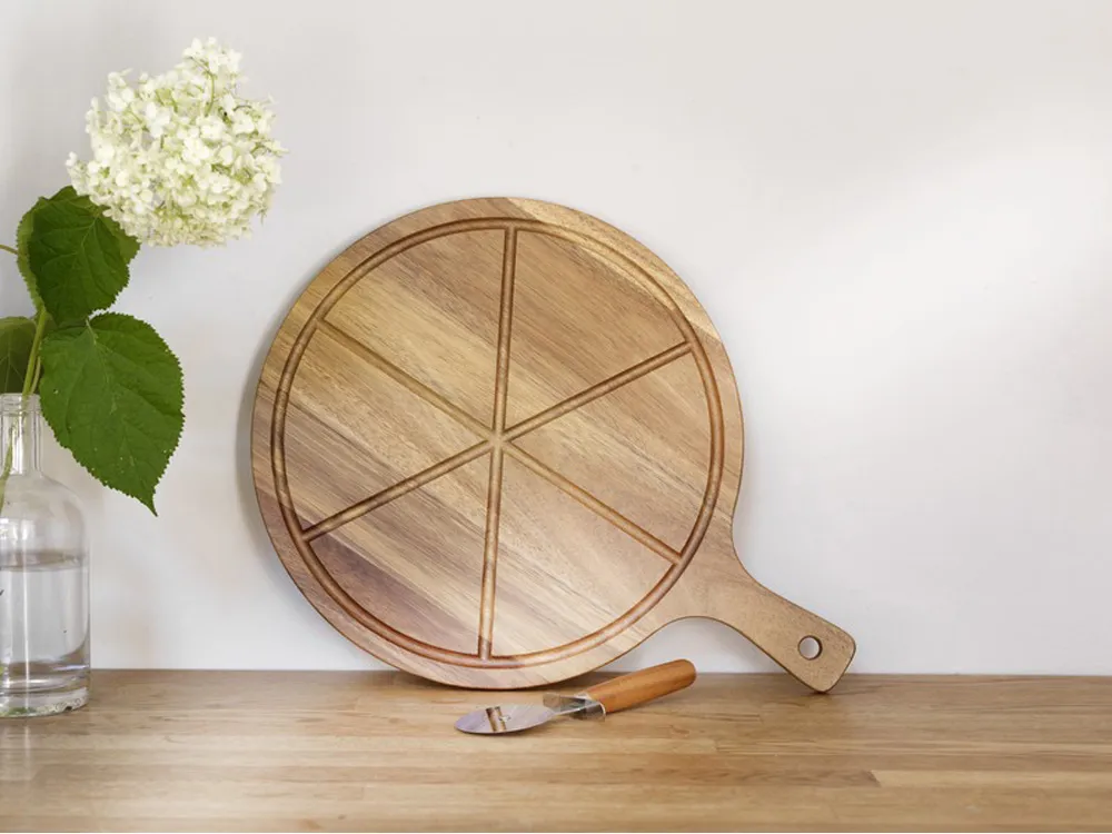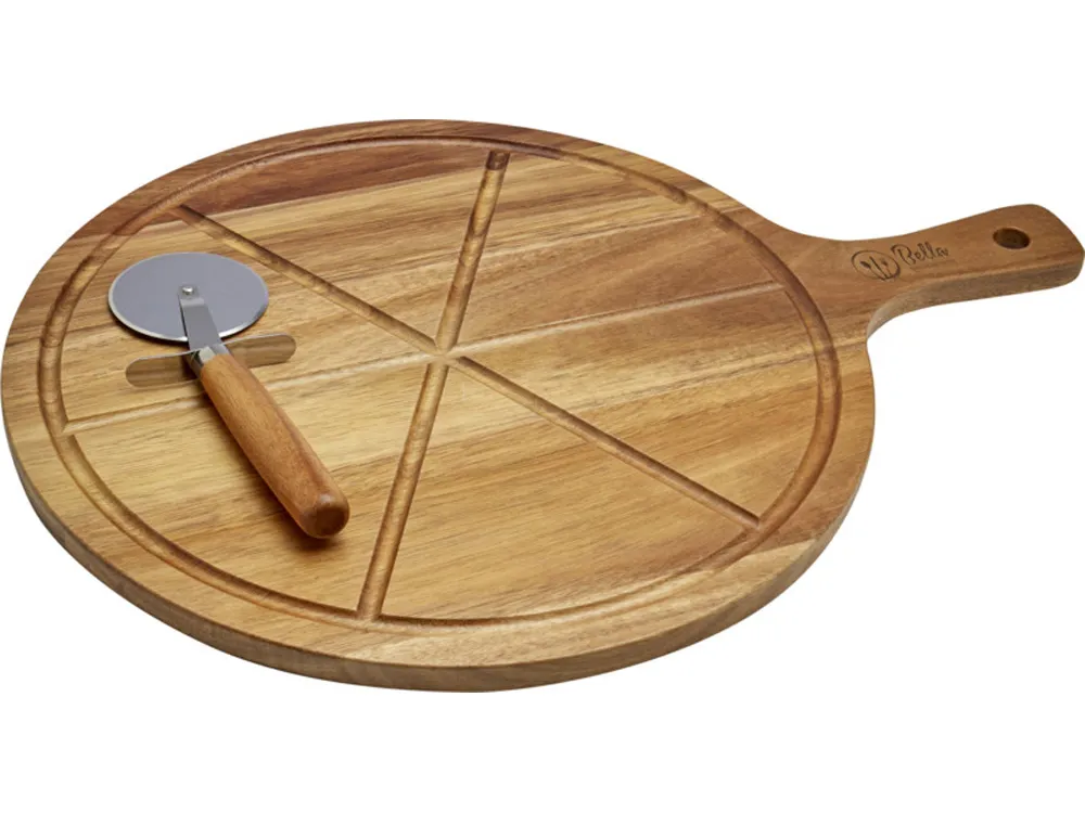 Набор для пиццы из дерева акации. В комплект входит лопата для пицца печи с 6 желобками для нарезки и порционирования, а также нож для пиццы. FSC certified acacia wood.