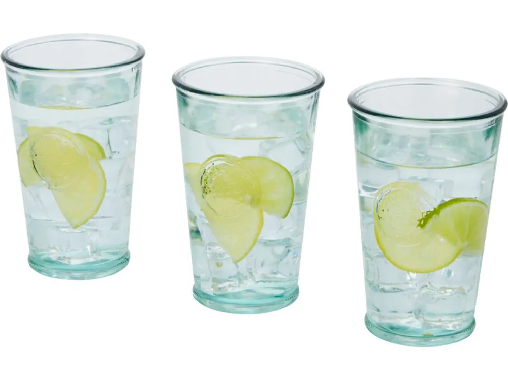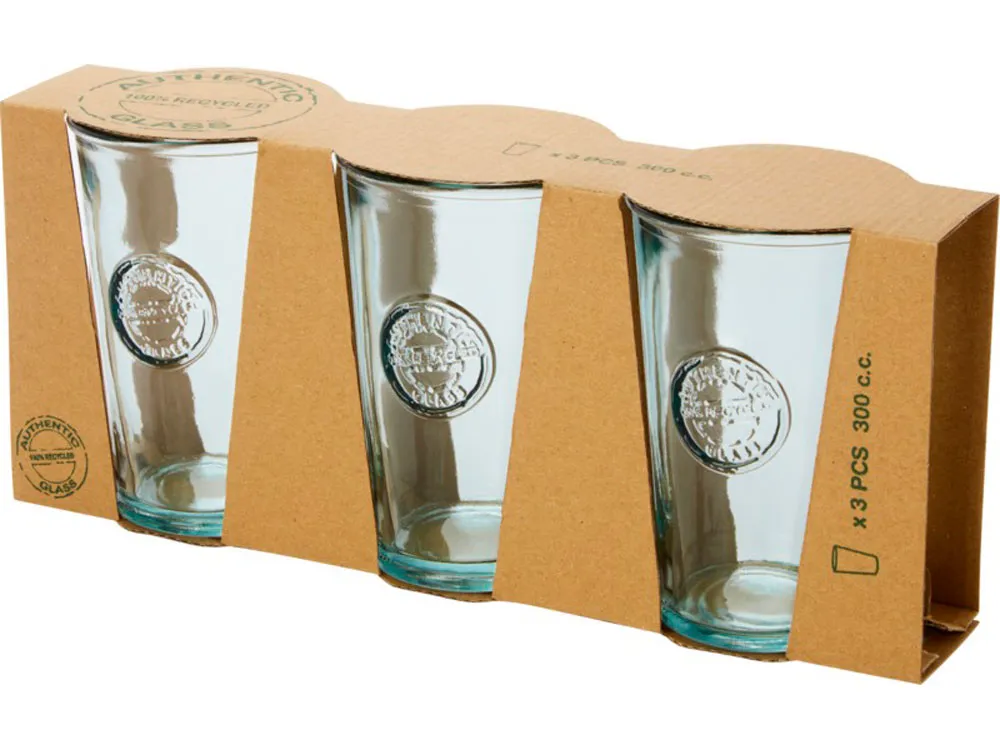 Набор из 3 стаканов объемом 300 мл, изготовленный из переработанного стекла. Для создания этого набора использована 1 стеклянная бутылка. Переработанное стекло не отличается ничем по качеству от обычного, но при этом является более экологичным, ведь на изготовление этого материала тратится меньше энергии, сырья и примесей. Размер стакана: высота 13 см, диаметр 8 см.