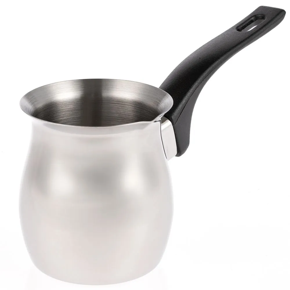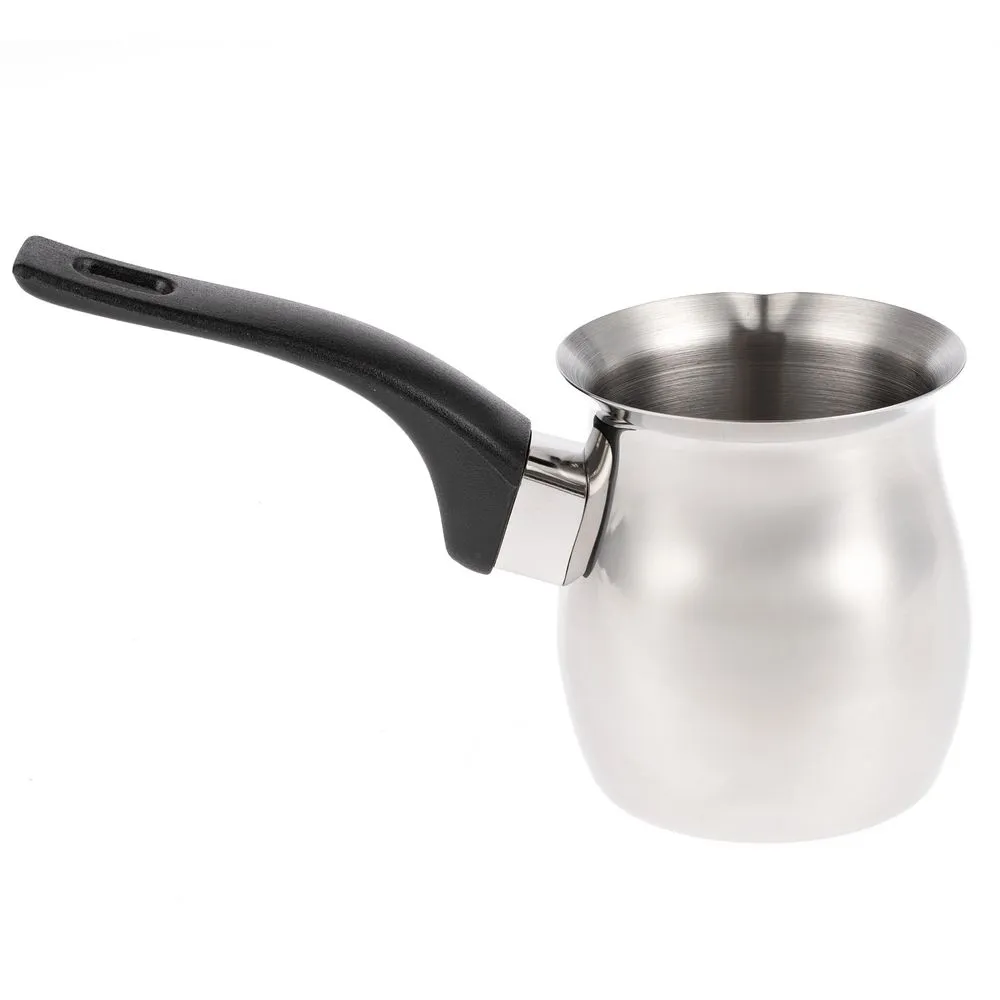 Турка из высококачественной нержавеющей стали не подвержена коррозии, не боится высоких температур и проста в уходе. Ручка турки выполнена из бакелита, благодаря чему не нагревается и не скользит в руке.Емкость 200 мл.