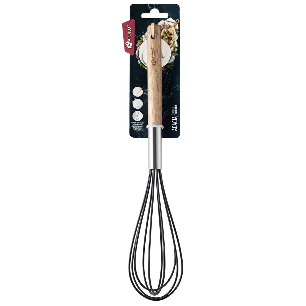 Венчик Acacia предназначен для взбивания холодных и горячих продуктов. Благодаря силиконовому покрытию не царапает поверхности и подходит для использования в посуде с антипригарным, тефлоновым или керамическим покрытием.Перед первым использованием помойте венчик с применением щадящих моющих средств.