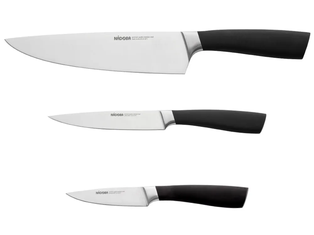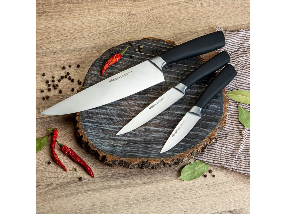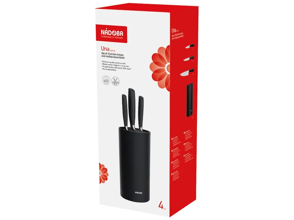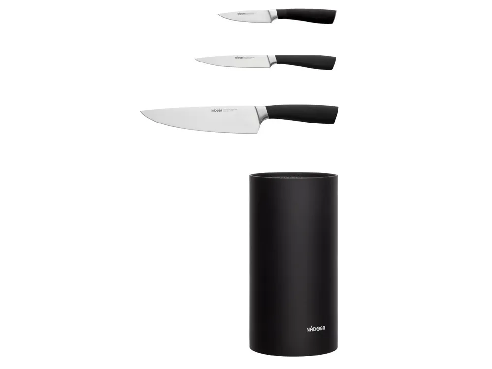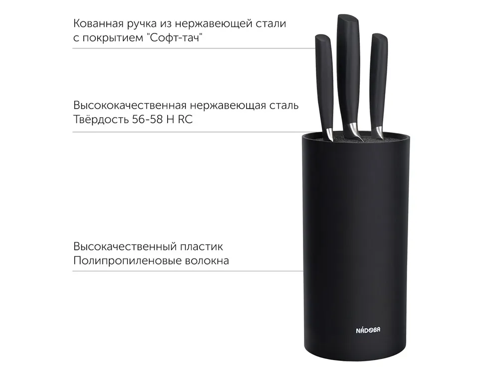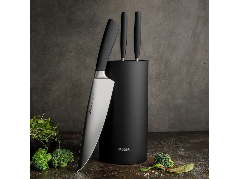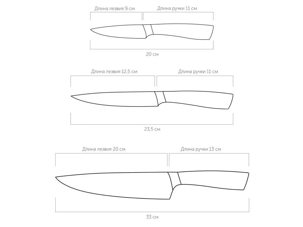 Набор из 3 кухонных ножей в универсальном блоке/ - Высококачественная нержавеющая сталь - Лезвие остаётся острым очень долгое время - Кованная ручка из нержавеющей стали с покрытием "Софт-тач" Комплектность: 1. Нож для овощей, 9 см 2. Нож универсальный, 12,5 см 3. Нож поварской, 20 см 4. Универсальный блок для ножей