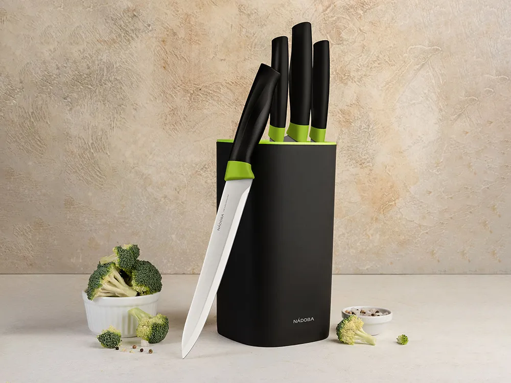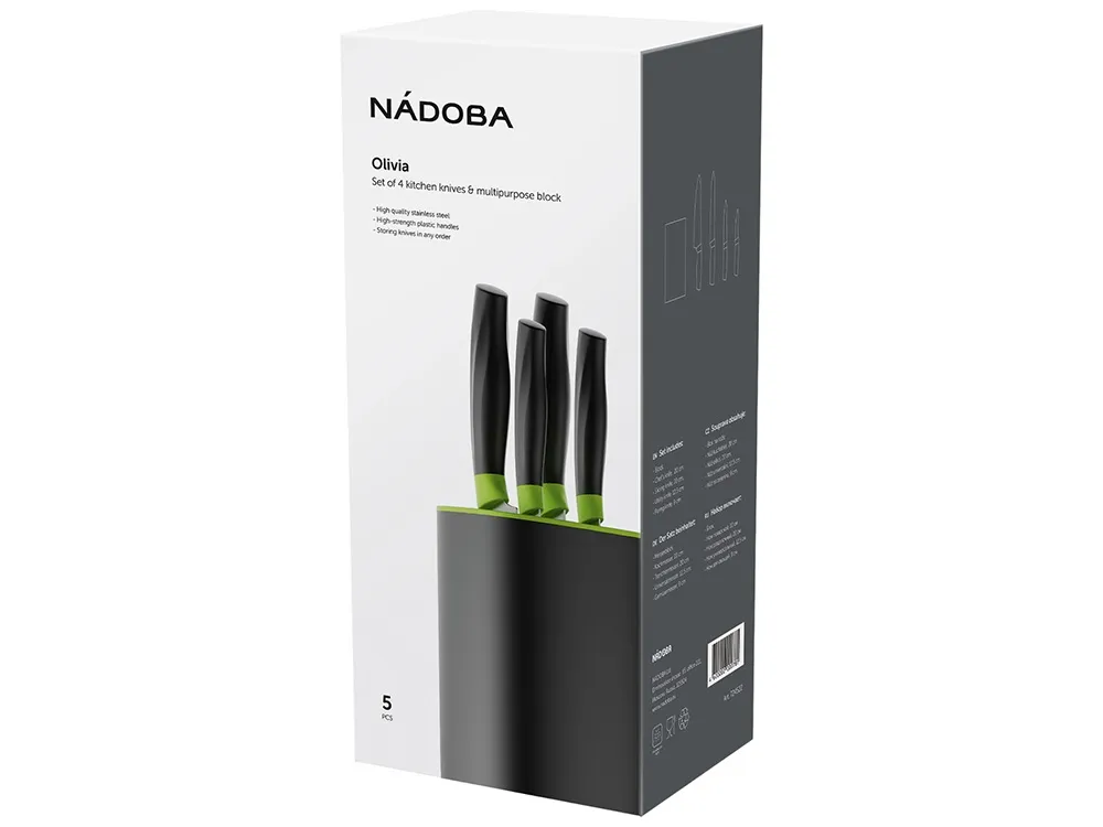 Набор ножей 5 предметов NADOBA серии Olivia состоит из: нож овощной, 9 см, нож универсальный, 12,5 см, нож разделочный, 20 см, нож поварской, 20 см и универсального блока для хранения ножей. Ножи выполнены из высококачественной нержавеющей стали с высоким содержанием углерода. Благодаря этому нож обладает высокой твердостью 52-54 HRC по шкале Роквелла и превосходными антикоррозийными свойствами. За счет пятигранного профиля и правильной толщины лезвий ножи обладают идеальным балансом и длительное время не требуют заточки. Блок нового поколения из высокопрочного пластика позволяет хранить ножи в любом количестве и произвольном порядке. Изделия можно мыть в посудомоечной машине. Гарантия на набор Olivia 5 лет.