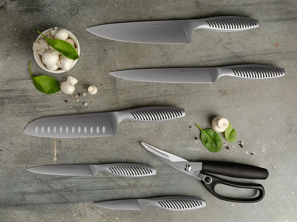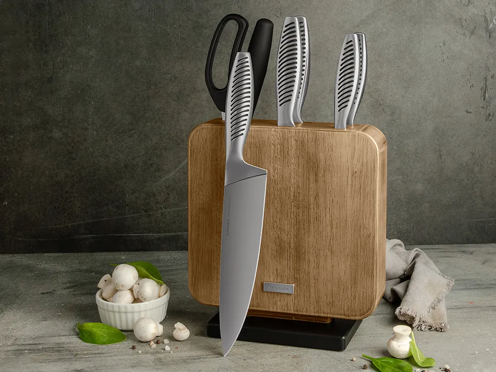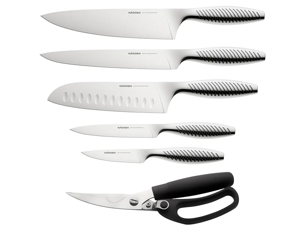 Набор цельнокованых ножей и ножниц в блоке включает в себя ножи: поварской 20 см, разделочный 20 см, Сантоку 18 см, универсальный 12,5 см, овощной 9 см и кухонные многофункциональные ножницы. Изделия выполнены из высококачественной стали премиум-класса с высоким содержанием углерода. Благодаря ковке и специальной термообработке ножи Vera обладают высокой твердостью по шкале Роквелла 56-58 HRC и устойчивы к коррозии. Высокая прочность ножей, хороший баланс, удобство и безопасность работы обеспечивается за счет правильной толщины лезвий. Длительное время не требуют заточки. Кованая рукоятка ножей исполнена из нержавеющей стали с уникальным противоскользящим узором, которое препятствует выскальзыванию ножа из руки во время работы, защищая от непредвиденных травм и порезов. Блок выполнен из натурального дерева (гевея). Ножи и ножницы Vera можно мыть в посудомоечной машине. Гарантия на все ножи NADOBA серии Vera 10 лет.