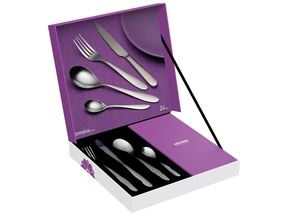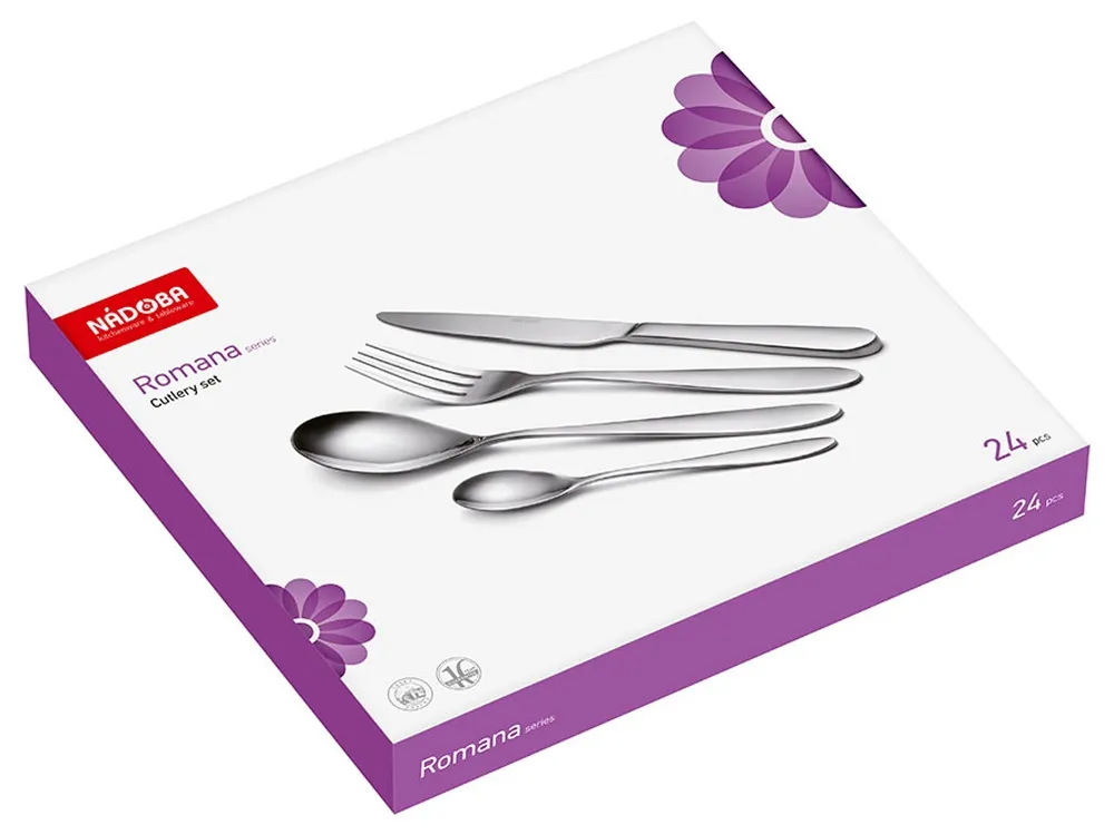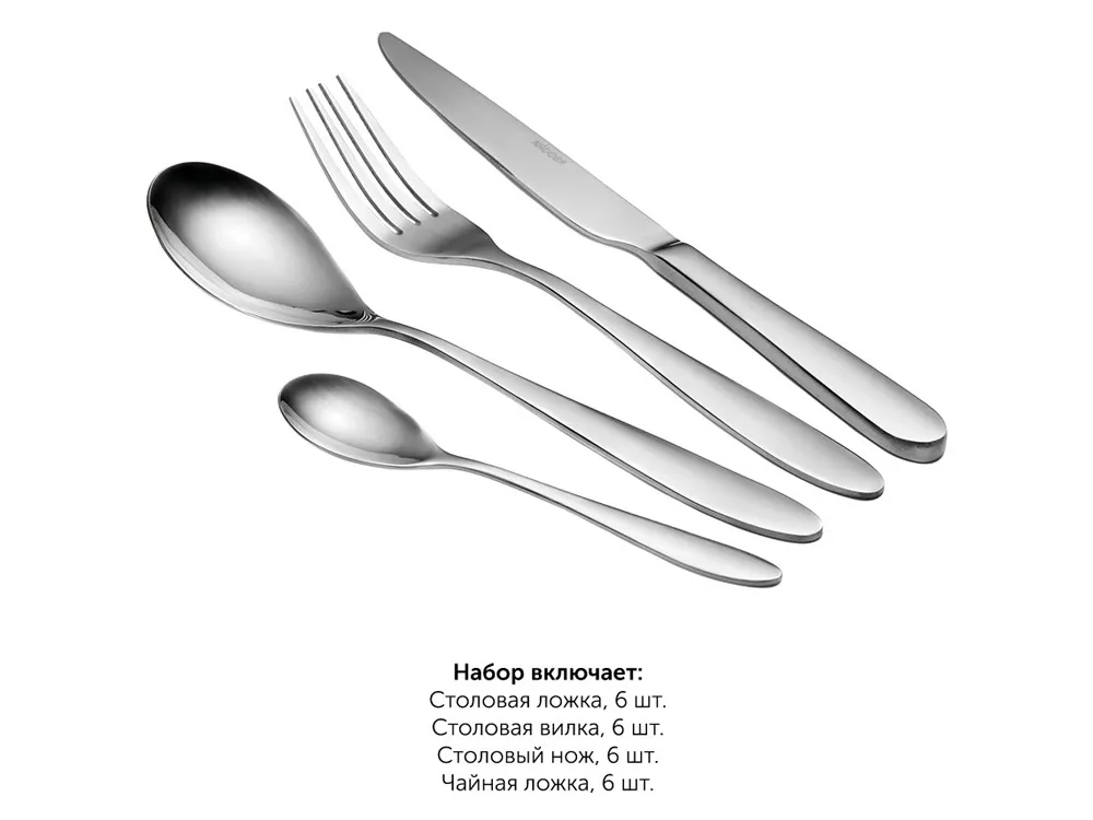 Приборы серии Romana изготовлены из высококачественной нержавеющей стали. Они устойчивы к механическим повреждениям и воздействию любых сред, не меняют вкус блюд и долгое время сохраняют превосходный вид, полученный благодаря высокой степени полировки. Гарантия на столовые приборы серии Romana 10 лет. Комплектность: 1. Столовая ложка, 6 шт 2. Столовая вилка, 6 шт 3. Столовый нож, 6 шт 4. Чайная ложка, 6 шт