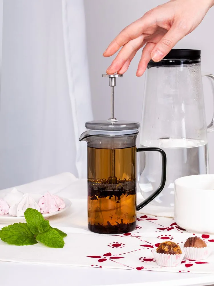 - Опустите пресс-фильтр: он плотно прижмет кофе или чайные листья ко дну колбы и не даст им попасть в напиток.