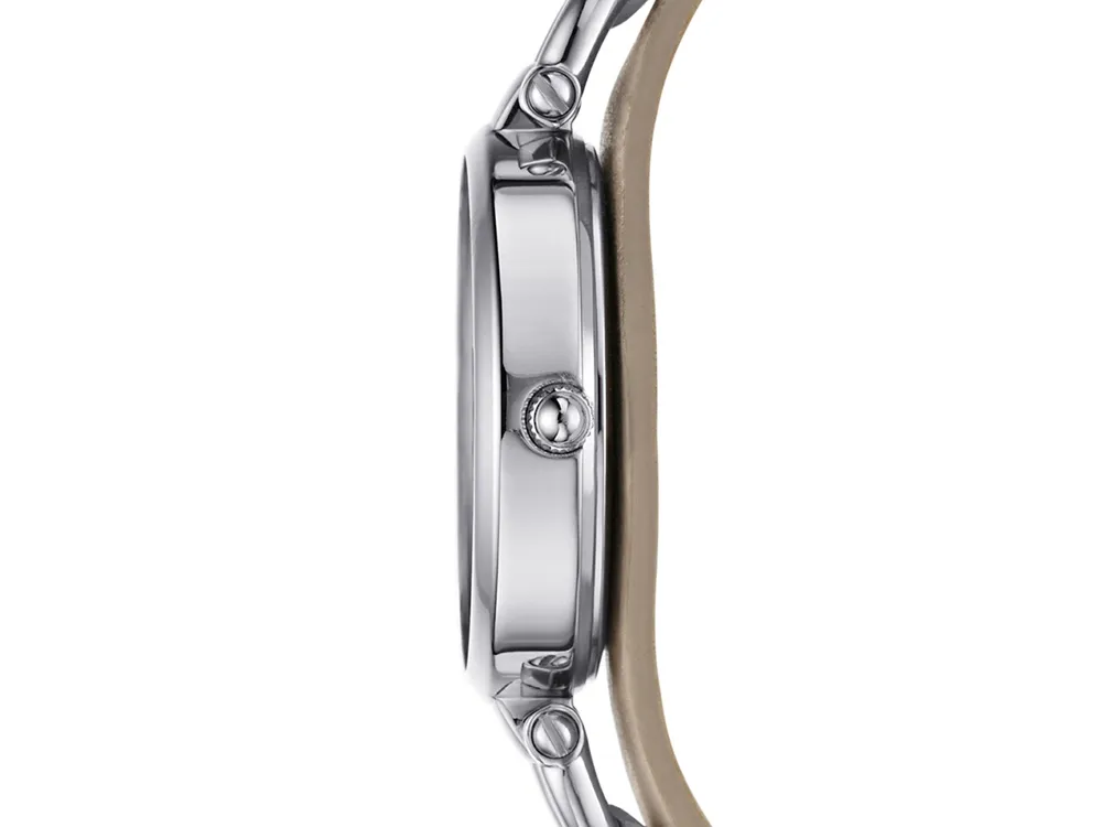 корпус- серебристый, циферблат- серебристый, крепление- темно-коричневый