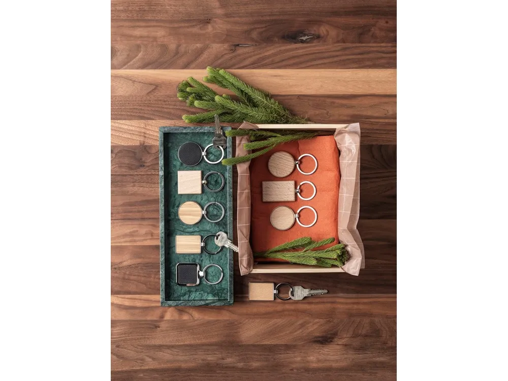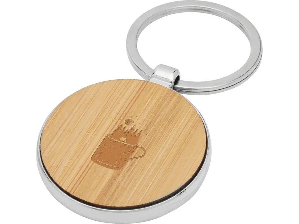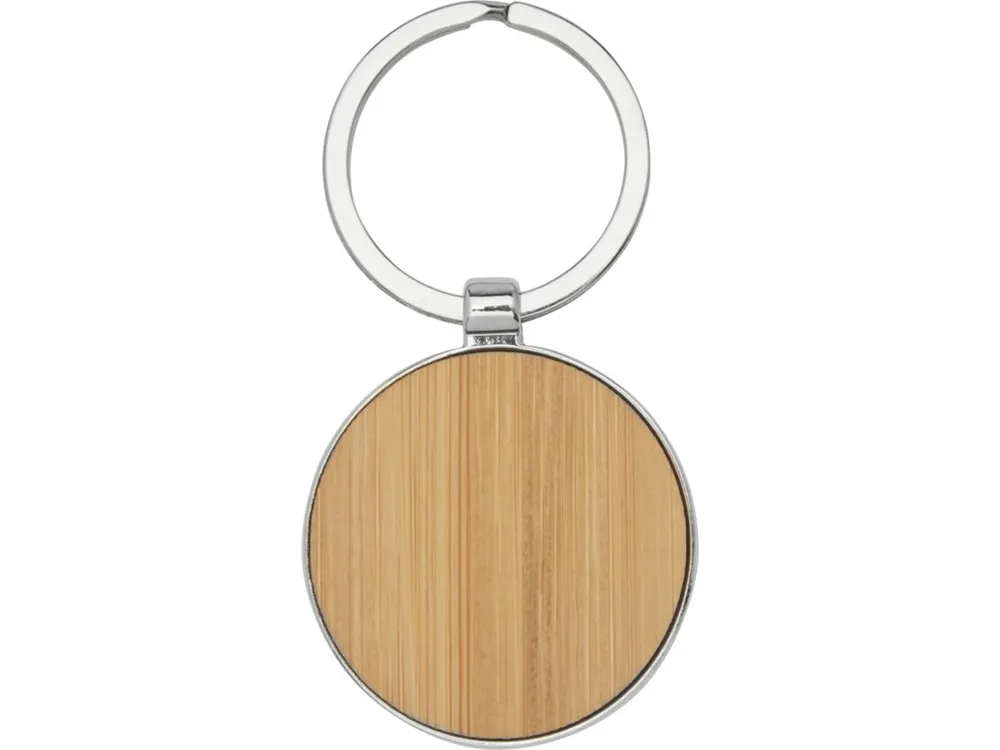 Круглый брелок премиум-качества из бамбука с металлическим корпусом из цинкового сплава, поставляемый в коричневой упаковке из шрифтовой бумаги. Диаметр брелка составляет 3 см. Подходит для лазерной гравировки.