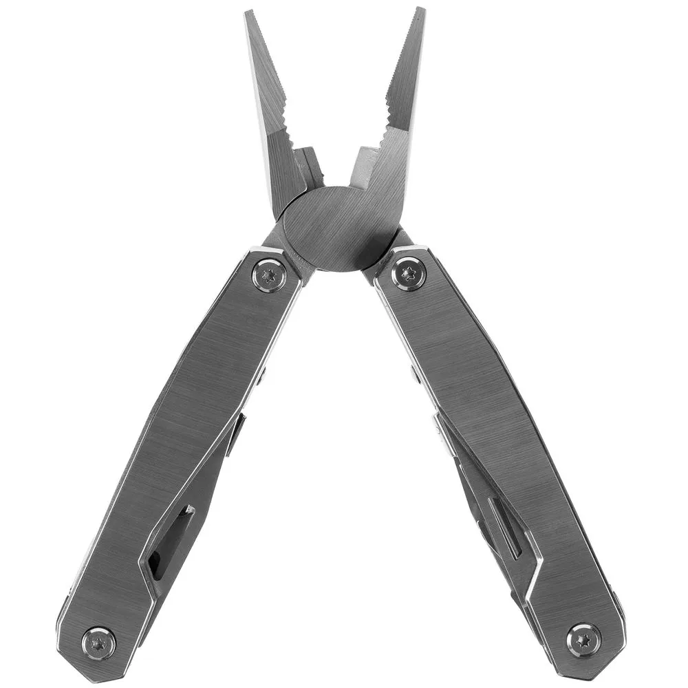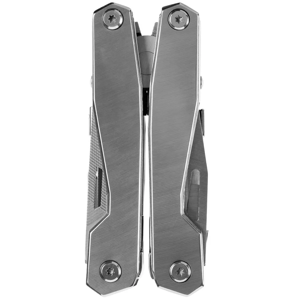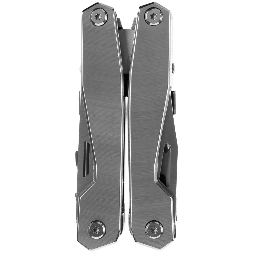 В комплекте мультитул, чехол и набор из 4 двусторонних съемных бит.