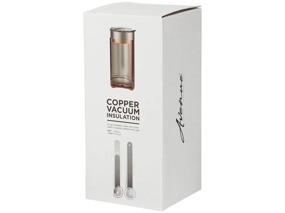 Вакуумная термокружка Valhalla с медным покрытием. Стильная термокружка с анти-скользящим пробковым основанием. Выполнена из нержавеющей стали с двойными стенками и вакуумной, медной изоляцией. Термокружка сможет сохранять температуру холодных напитков до 24 часов, а горячих - до 8 часов. Конструкция также предотвращает образование конденсата снаружи. Объем 500 мл. Нержавеющая сталь.