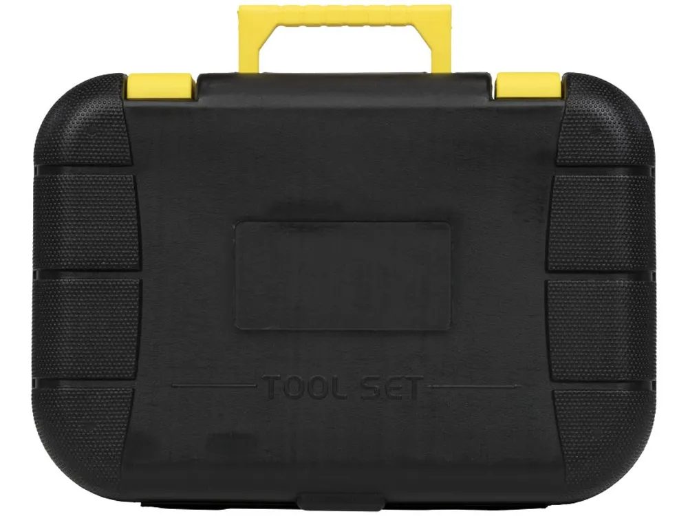 Инструментальный ящик с замком и складной ручкой, включающий молоток-гвоздодер, отвертку с плоским шлицем 4 мм, универсальные плоскогубцы, универсальный нож с фиксатором, 5 шестигранных ключей (2-6 мм) с держателем со стандартными и шаровыми наконечниками, измерительную рулетку длиной 3 м с фиксатором, индикаторную отвертку, изоляционную ленту и 4 прецизионных отвертки. Пластик ABS.
