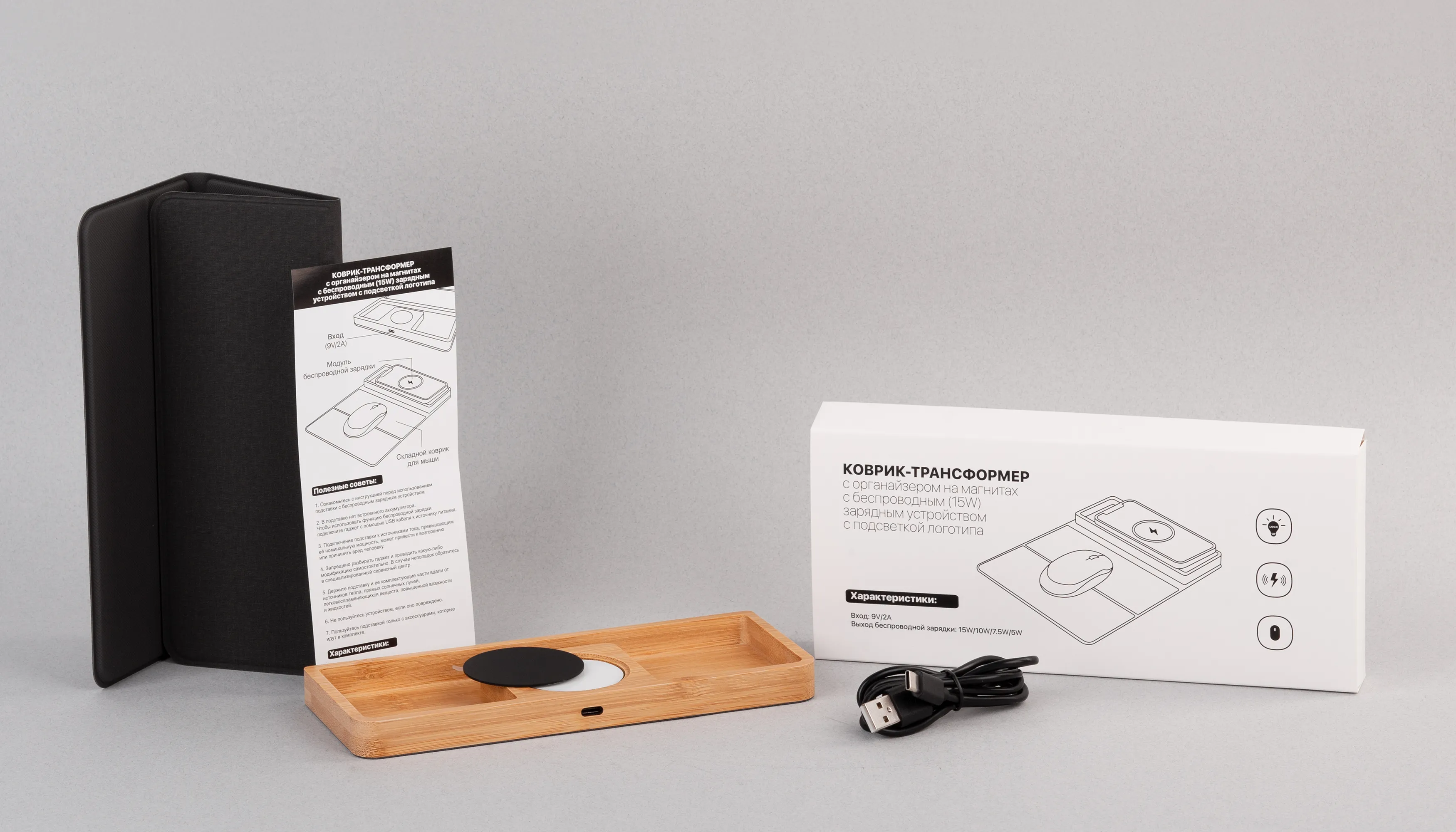Оригинальный набор - бамбуковая подставка-органайзер с быстрой беспроводной зарядкой с подсветкой логотипа и складной коврик-трансформер для мыши. Оба предмета могут превратиться в единую настольную конструкцию - органайзер может присоединиться к коврику с одной из сторон (справа или слева) при помощи встроенных магнитов.