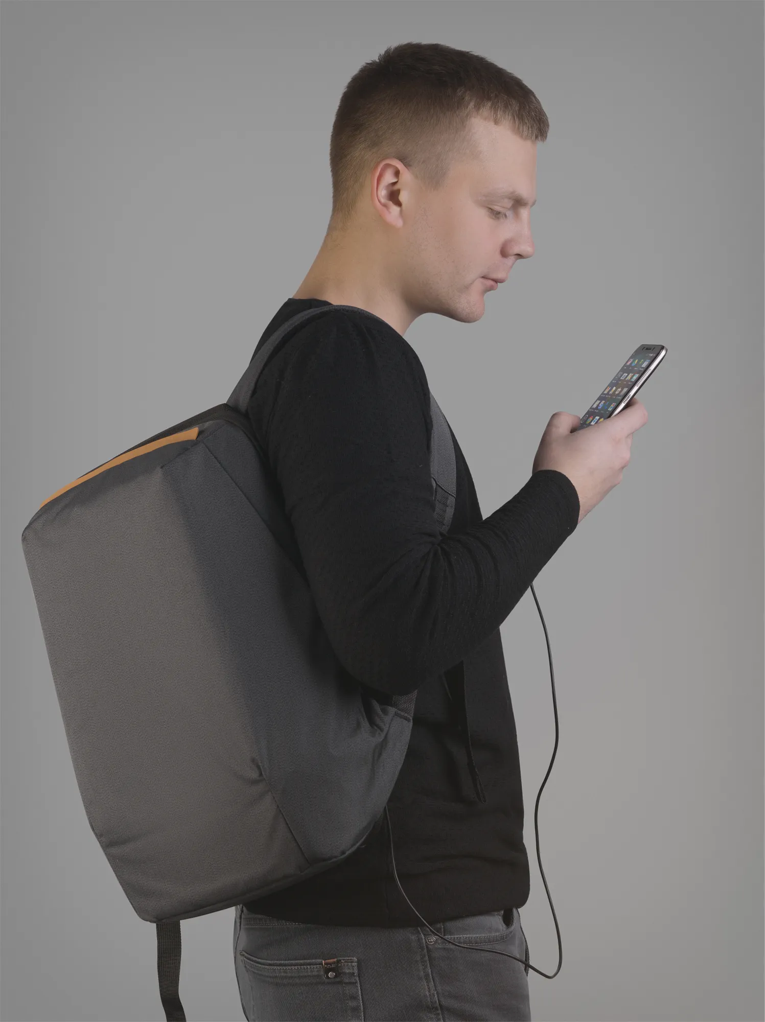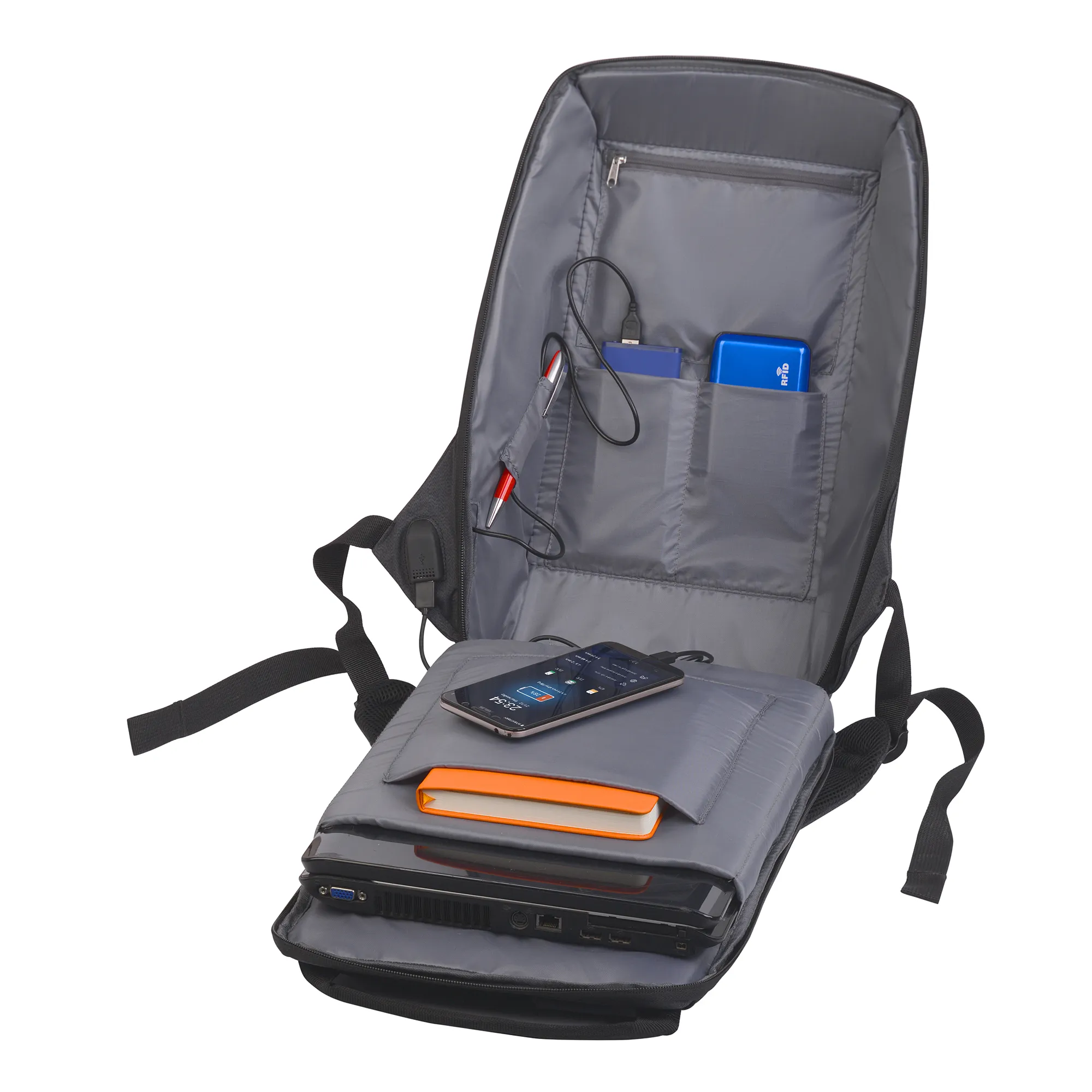 Модель имеет плотный каркас, за счёт которого рюкзак превосходно держит форму, вне зависимости от степени наполнения. Минималистичный дизайн подчеркивает элемент из искусственной кожи в верхней части рюкзака. Обладатель этого аксессуара оценит мягкую спинку (с сеткой), лямки удобной формы, ручку smart sleeve и внешний USB-порт для зарядки.