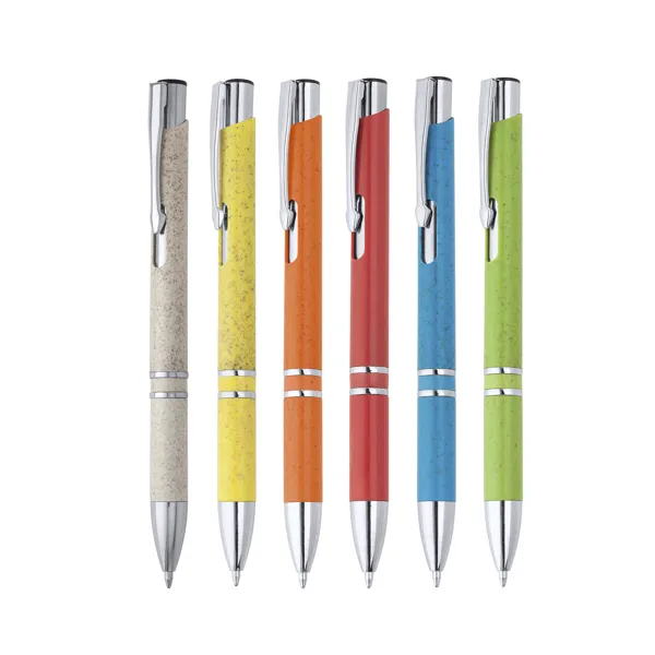 Кнопочная ручка из пшеничного волокна и АБС с серебряными деталями. Джамбо-заправка синими чернилами. Пшеничное волокно и ABS.