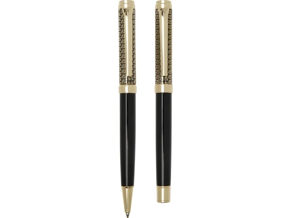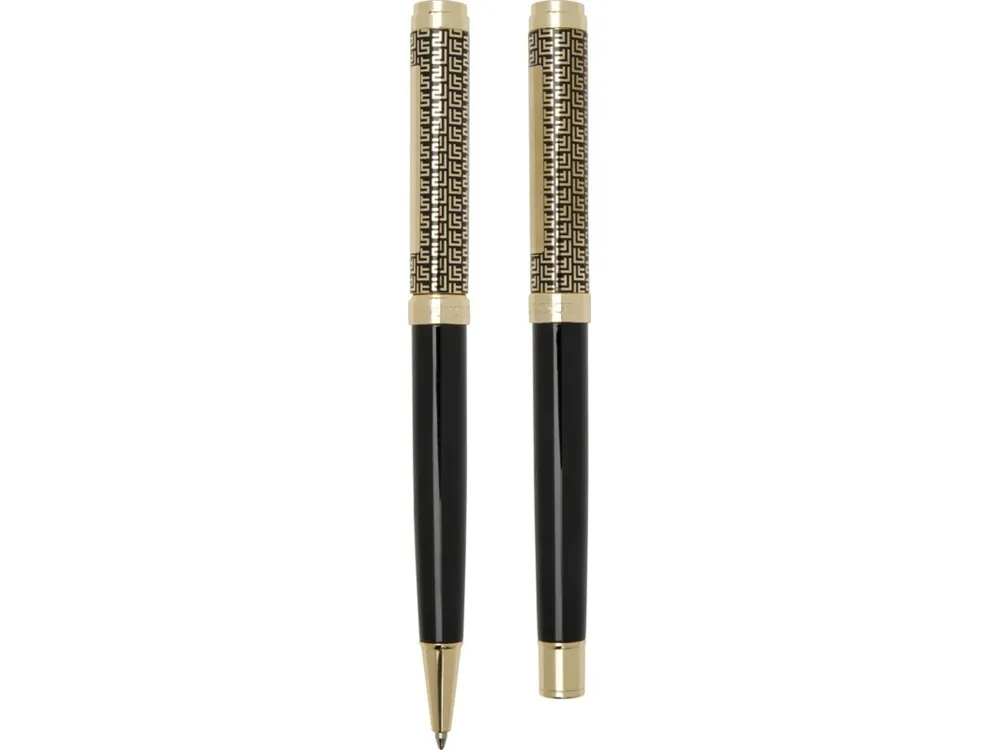 Набор ручек Legato представляет собой элегантное сочетание шариковой ручки и ручки-роллера. Обе ручки имеют верхний корпус из переработанной латуни с золотой хромированной отделкой, нижний корпус с черным напылением, аксессуары из металлического золота с хромированием, логотип LUXE на среднем кольце и синие чернила. Шариковая ручка имеет длину письма 800 метров и размер пера 1,00 мм. Ручка-роллер имеет длину письма 400 метров и размер пера 0,7 мм. Recycled brass. #?0:>2:0: FSC Mix Credit P5.1 CU-COC-877277.