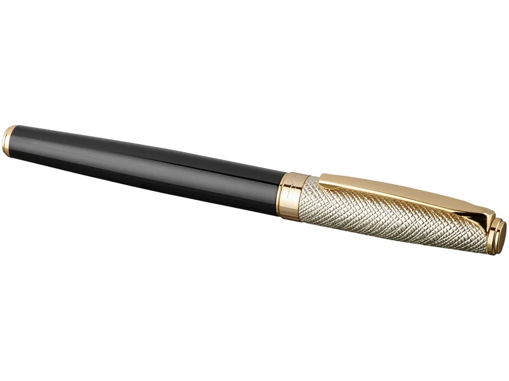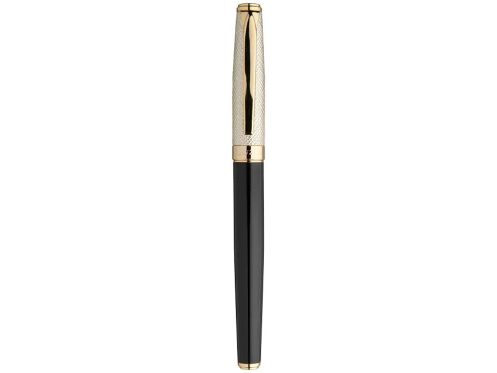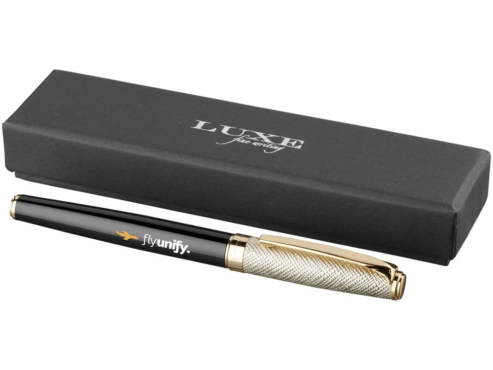 Роскошная ручка-роллер с золотым кожаным колпачком и лакированными золотыми деталями, поставляется в подарочной коробке LUXE. Нижняя часть корпуса выполнена из латуни, покрытой лаком, а верхняя — из латуни и полиуретна. Ручка-роллер: 14 см х 1,15 см, вес: 32 г, длина непрерывной линии: 500 м.