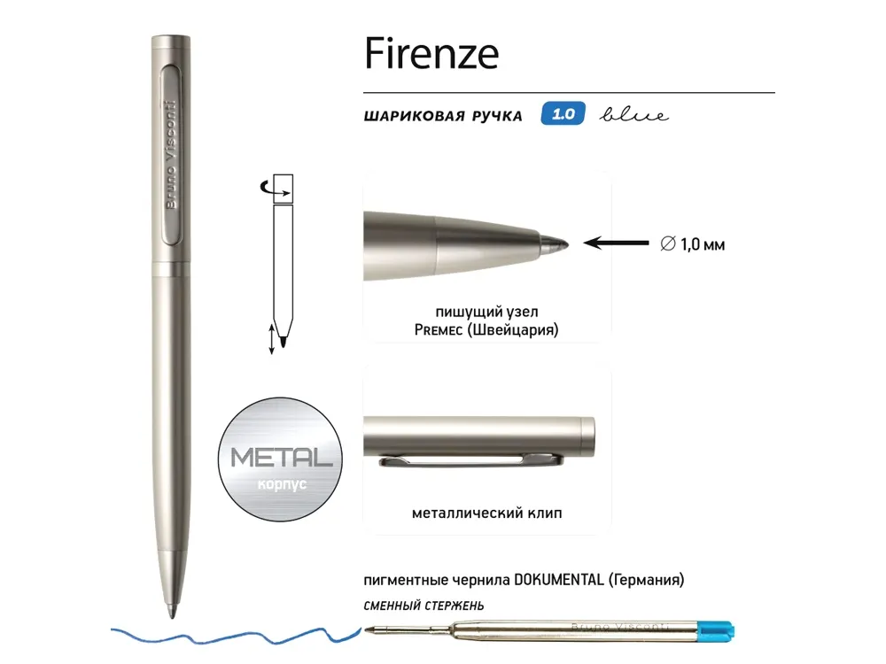 Шариковая металлическая ручка из коллекции «Firenze» от Bruno Visconti - бизнес-аксессуар, с которым вы всегда будете чувствовать себя уверенно и комфортно. Лаконичный дизайн, строгость формы, прочный металлический корпус в цвет серебра подчеркнут статус владельца ручки. Ручка автоматическая, с легким поворотным механизмом подачи стержня. Надежный пишущий узел d 1,0 мм (от швейцарского производителя Premec) гарантирует высокое качество так же, как и пигментные чернила Dokumental (Германия). Благодаря им писать ручкой «Firenze» одно удовольствие – она мягко скользит по поверхности бумаги, оставляя ровную, четкую линию.