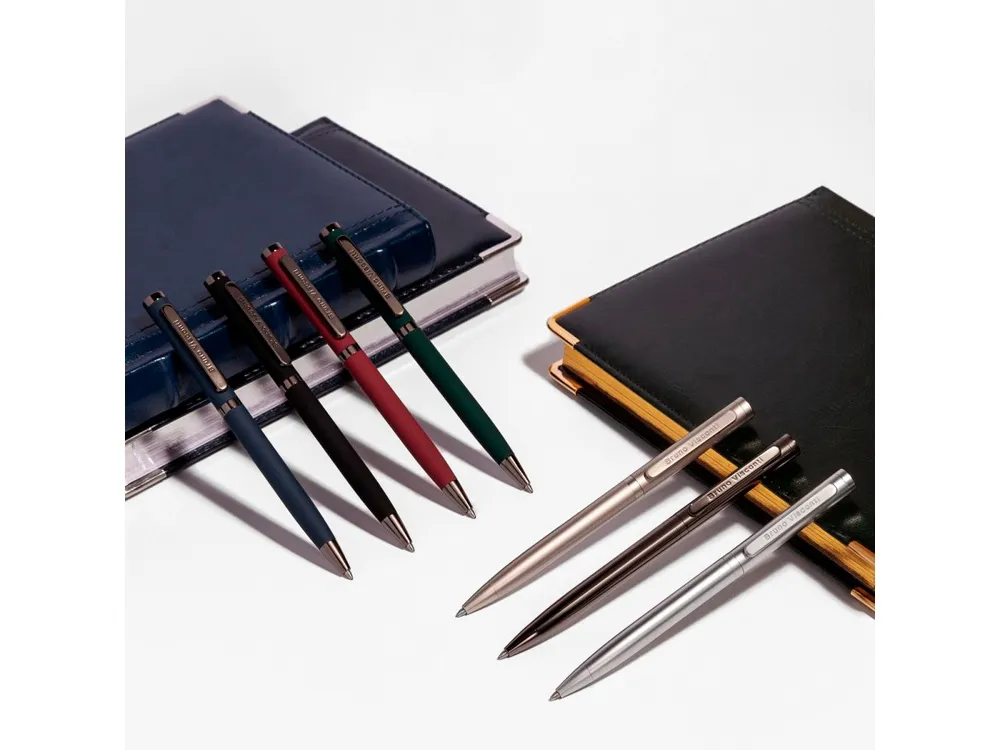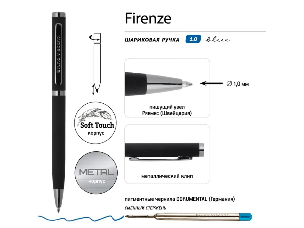 Шариковая металлическая ручка из коллекции «Firenze» от Bruno Visconti - бизнес-аксессуар, с которым вы всегда будете чувствовать себя уверенно и комфортно. Лаконичный дизайн, прочный металлический корпус, строгость формы подчеркнут статус владельца ручки. Удобство в эксплуатации и тактильно приятные ощущения подарит бархатистое покрытие Soft Touch. Ручка автоматическая, с легким поворотным механизмом подачи стержня. Надежный пишущий узел d 1,0 мм (от швейцарского производителя Premec) гарантирует высокое качество также, как и пигментные чернила Dokumental (Германия). Благодаря им писать ручкой «Firenze» одно удовольствие – она мягко скользит по поверхности бумаги, оставляя ровную, четкую линию.