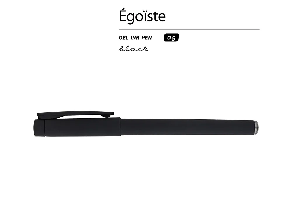 Линия гелевых ручек Egoiste выпускается в эргономичных округлых корпусах утолщенного диаметра. Современное антискользящее покрытие черного корпуса на ощупь напоминает прорезиненные поверхности или карбон. Повышенная прочность достигается за счет металлизированного наконечника, в котором закреплен пишущий узел Premec (Швейцария) толщиной 0,5 мм. В стержнях использованы японские чернила Mikuni синего цвета.