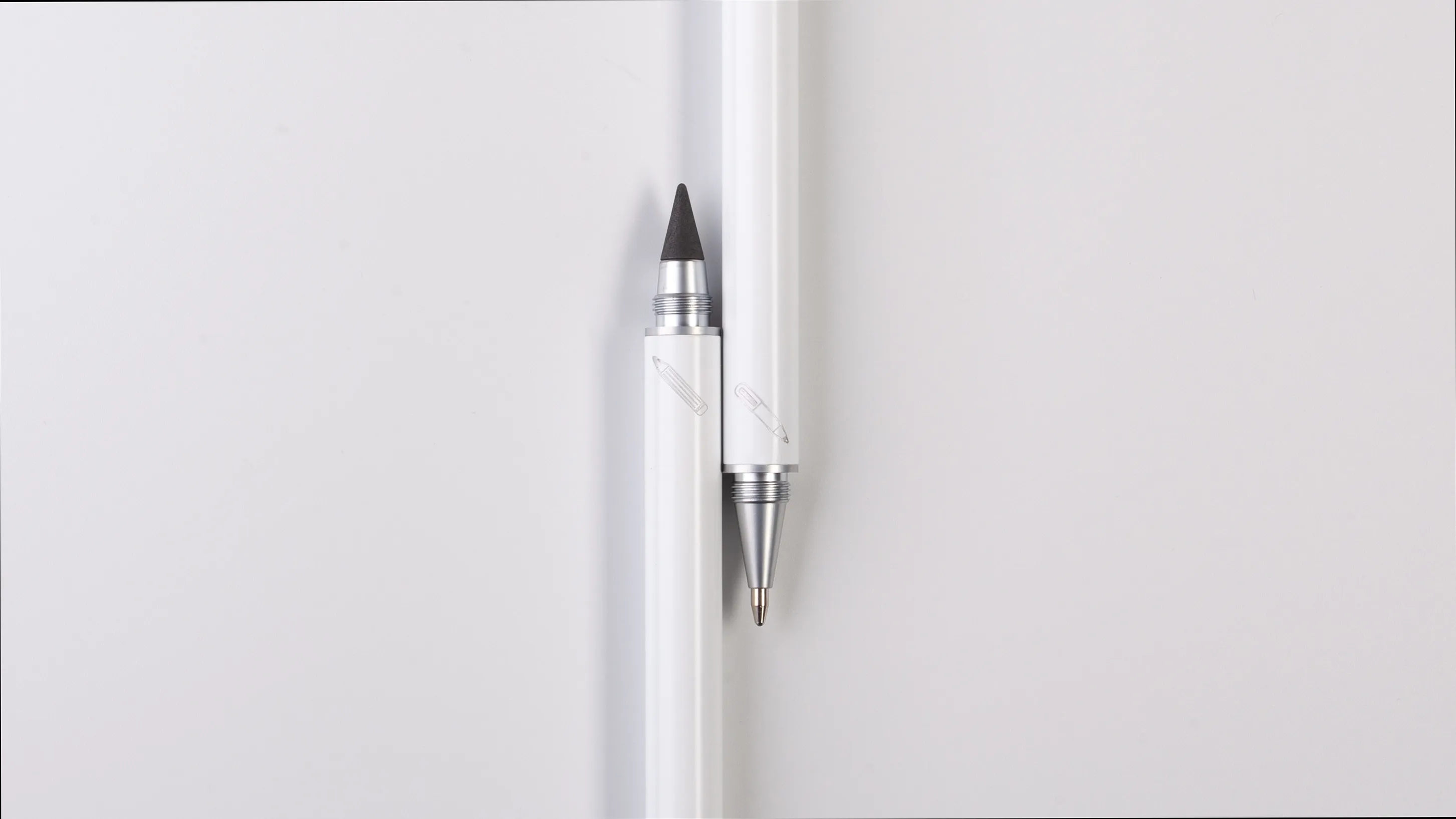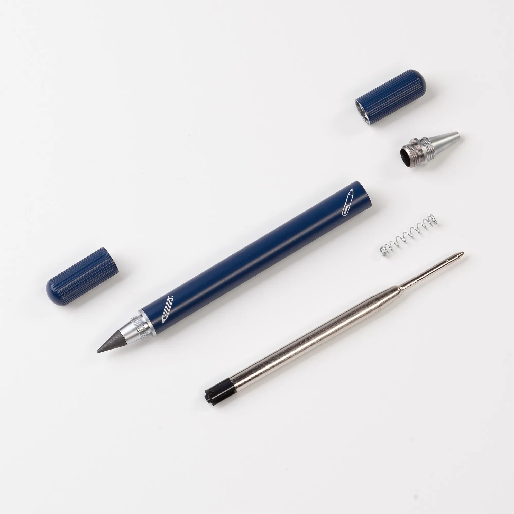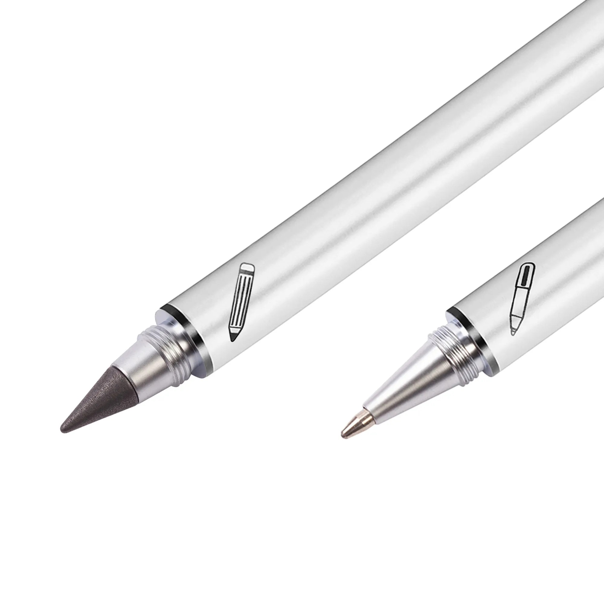 Набор из 2х письменных принадлежностей в едином корпусе - шариковой ручки и вечного карандаша, грифель которого выполнен из сверхпрочного графита с длиной письма до 30 000 метров, Закручивающиеся колпачки надёжно сохраняют пишущие узлы от внешних воздействий.