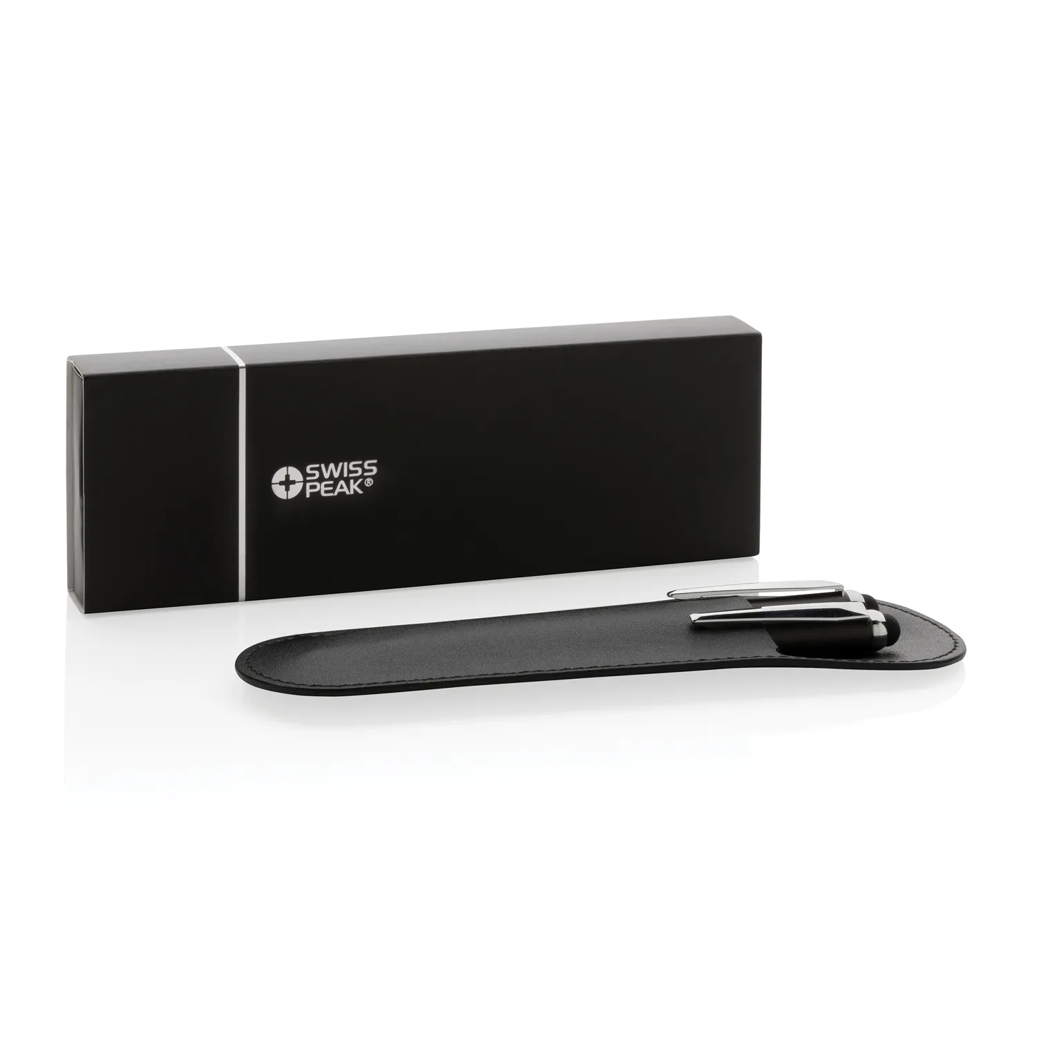 Роскошный набор от Swiss Peak включает в себя шариковую ручку и ручку-роллер. Матовый алюминиевый корпус с серебристым глянцевым клипом. Обе ручки заправлены немецкими чернилами Dokumental синего цвета. Длина письма для шариковой ручки — 1200 м, для ручки-роллера — 400 м. Набор поставляется с чехлом из полиуретана и фирменной черной коробкой.