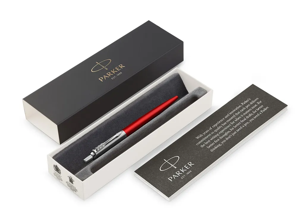 Шариковая ручка, нажимной механизм Ручка может быть укомплектована стержнем с чернилами черного или синего цвета (подробнее вы можете уточнить у менеджера). - Материал корпуса: Пластик/нержавеющая сталь - Покрытие корпуса: Пластик - Материал отделки деталей корпуса: Нержавеющая сталь - Выгравированный логотип PARKER на корпусе ручки.
