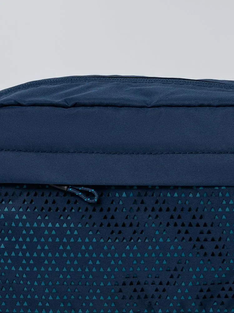 Цвет Outer Space лег в основу коллекции сумок Triangel, позволяя создать модное монохромное сочетание с изделиями Manevr темно-синего цвета. Изделия изготовлены из шелковистого полиэстера, в отделке использована лазерная перфорация паттерна.