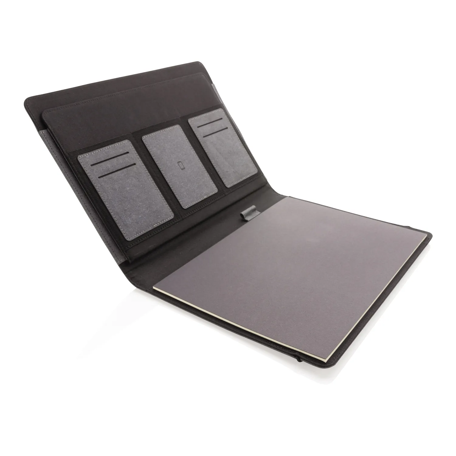 Добавьте немного изысканности в вашу повседневную работу. Храните важные документы, визитки и заметки в одном месте. Внутри органайзера формата А4 вы найдете блокнот из переработанной бумаги (20 линованных листов плотностью 64 г/м2), а также 1 большой карман, 3 эластичных отсека и 4 держателя для карт и визиток.