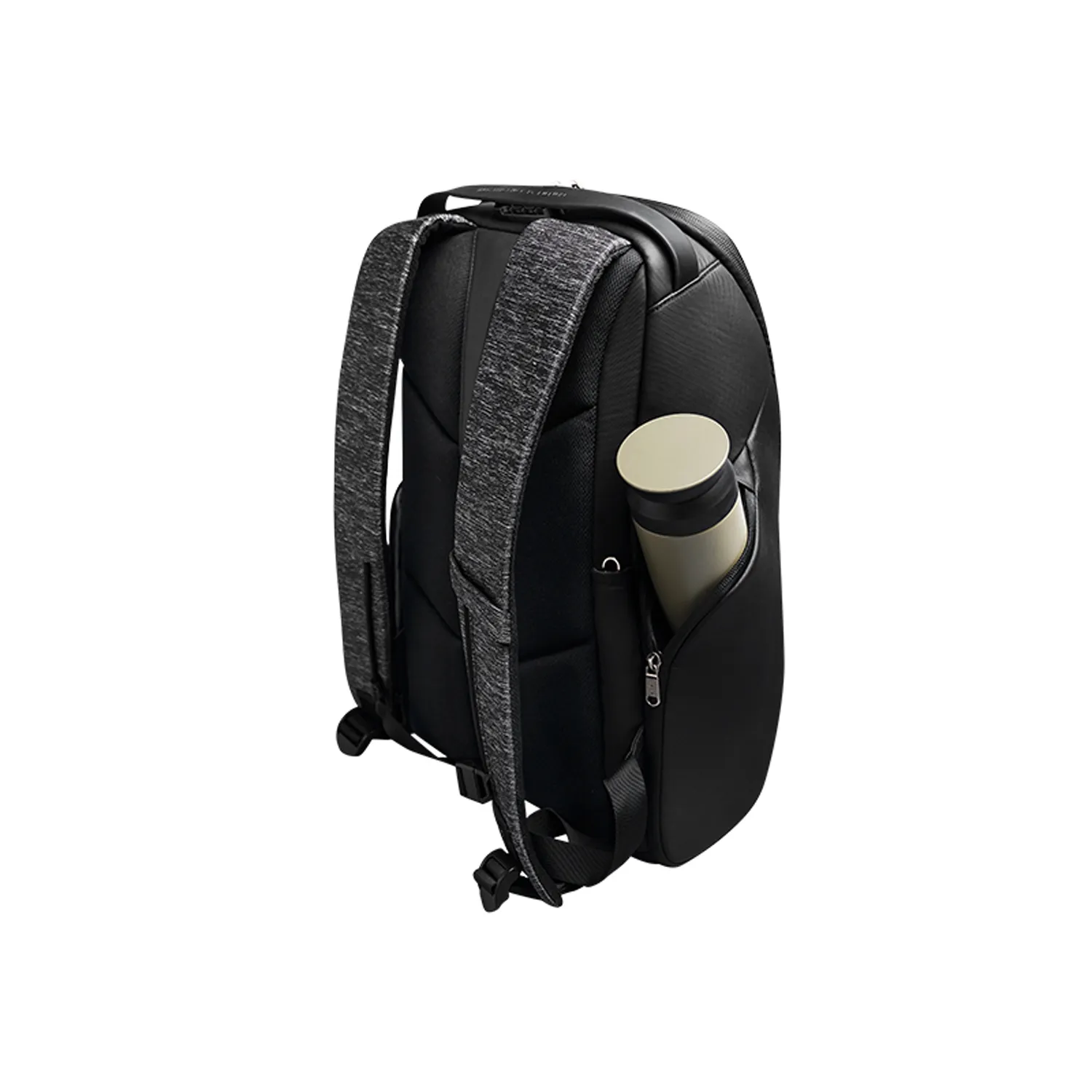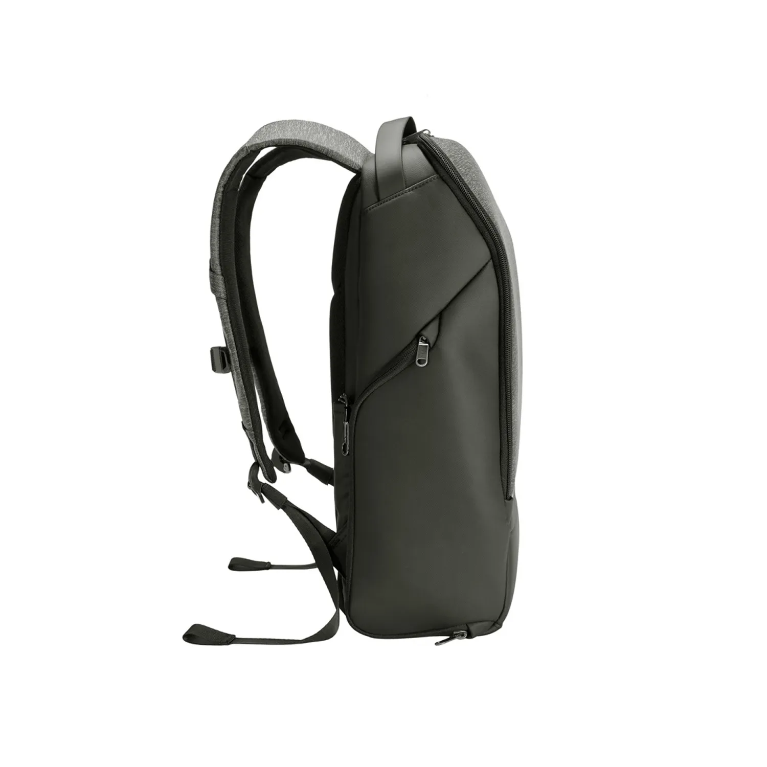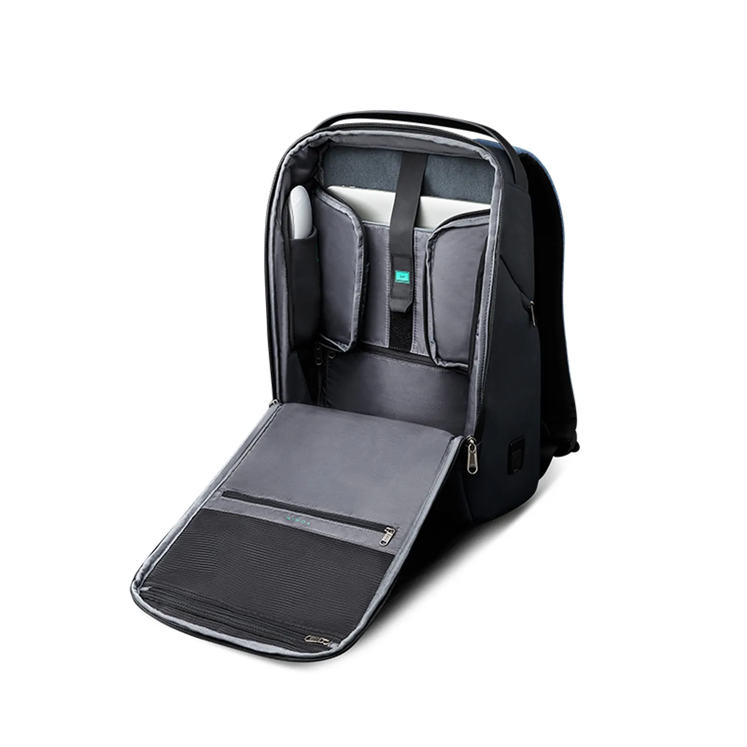 Вместительный водозащищенный рюкзак FlexPack Pro, обладатель премий iF Design Award 2019, Golden Pin Design Award, China Outstanding Industrial Design (CEID) Award, Governor Cup Industrial Design Excellence Award. Сделан из комбинации высокопрочных устойчивого к порезам и трению водоотталкивающих материалов: полиэстера и ткани многослойного плетения разных типов (нейлон, полиэстер и стекловолокно) черного и темно-серого цветов. Не требует специального ухода. Конструкция рюкзака достаточно жесткая, не деформируется. Внутри рюкзака есть специальный карман, в который можно поместить powerbank, т к в него приходит USB-кабель (600 мм, 0,5-0,7 А, 5В), соединенный с портом на внешней стороне рюкзака для легкого подключения к смартфону. Это оригинальная запатентованная система зарядки K EasyCharging 1.0 с помощью USB-порта, расположенного в борту рюкзака, и кабеля, идущего к powerbank, что делает мобильную зарядку более удобной. Детально продуманная организация отделений позволяет грамотно распределить вес. Самые тяжелые предметы располагаются ближе к спине. Ноутбук надежно фиксируется и не перемещается при ходьбе. Внутри рюкзака есть 5 дополнительных карманов на молниях. Специальная анатомическая конструкция вентилируемых мягких спинки и лямок и дополнительная поперечная лямка на магнитной застежке снижает нагрузку на плечи и спину, вес рюкзака воспринимается на 20-25% легче, чем при использовании стандартных моделей рюкзаков. • Размер рюкзака 47х34х18 см • Объем 18 л • Вес 1330 гр Ключевые моменты: • Водонепроницаемая молния с фиксацией кодового замка TSA007 с функцией таможенного досмотра • Карман для powerbank с USB-кабелем (600 мм, 0,5-0,7 А, 5В) • Рюкзак оснащен стальным тросом, которым можно обхватить неподвижный предмет и затем зафиксировать в кодовом замке. Внутреннее наполнение: • Отделение для ноутбука диагональю до 15,6” • 5 дополнительных карманов на молниях 3 кармана 15-17х21-26 см 2 боковых кармана с отделениями для телефона и мелочей - 11,5х20 см Внешняя сторона: • 2 easy access кармана на водонепроницаемых молниях - 22х12 см • Петля для очков или наушников на лямке • Удобная ручка из высококачественной прочной резины