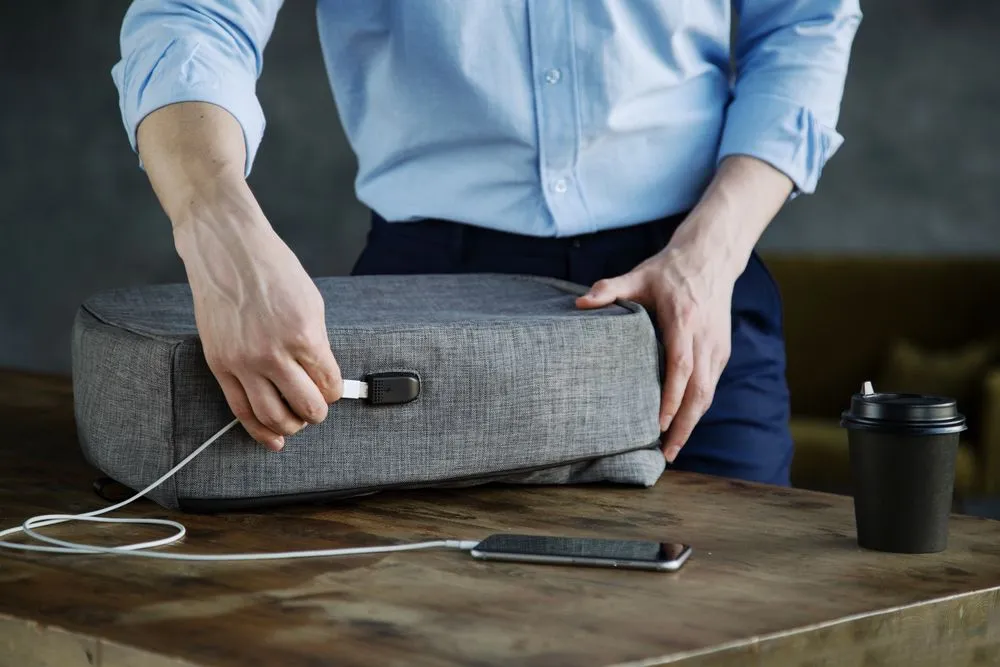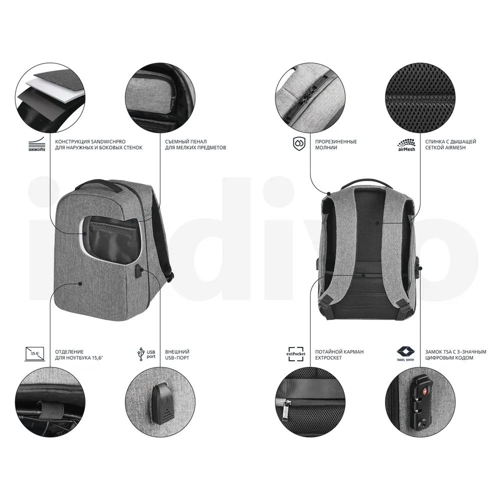 - Внешний USB-порт для зарядки гаджетов (внутри рюкзака — провод для подключения и карман для размещения аккумулятора)