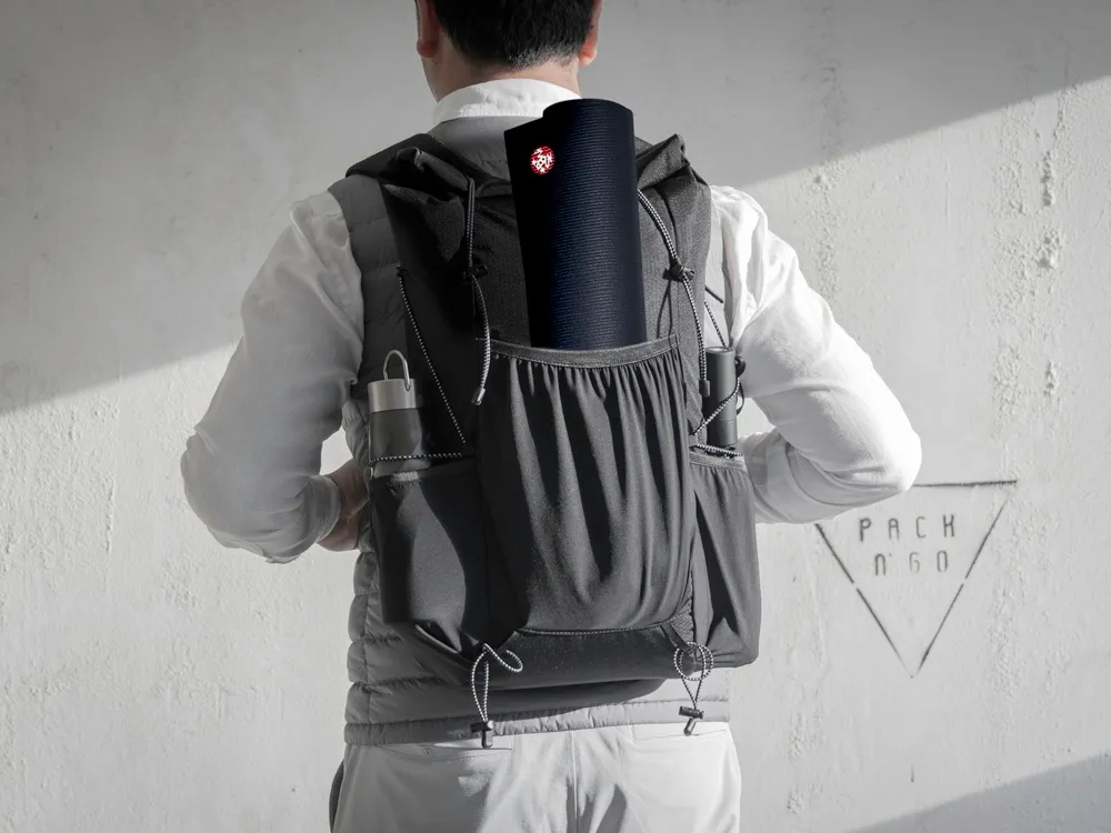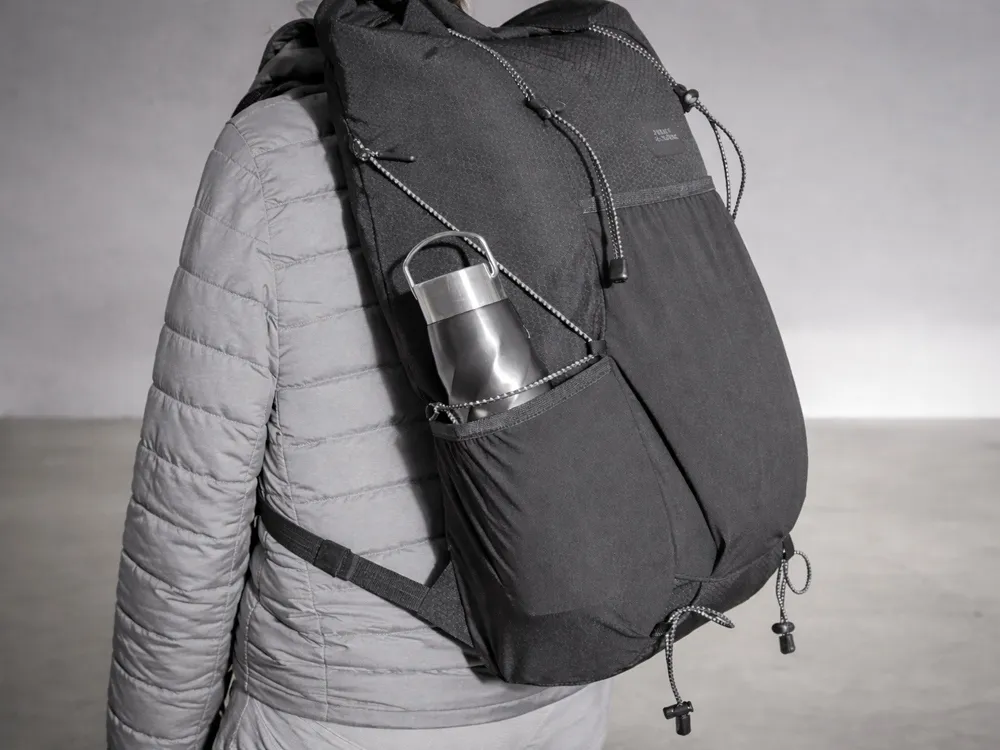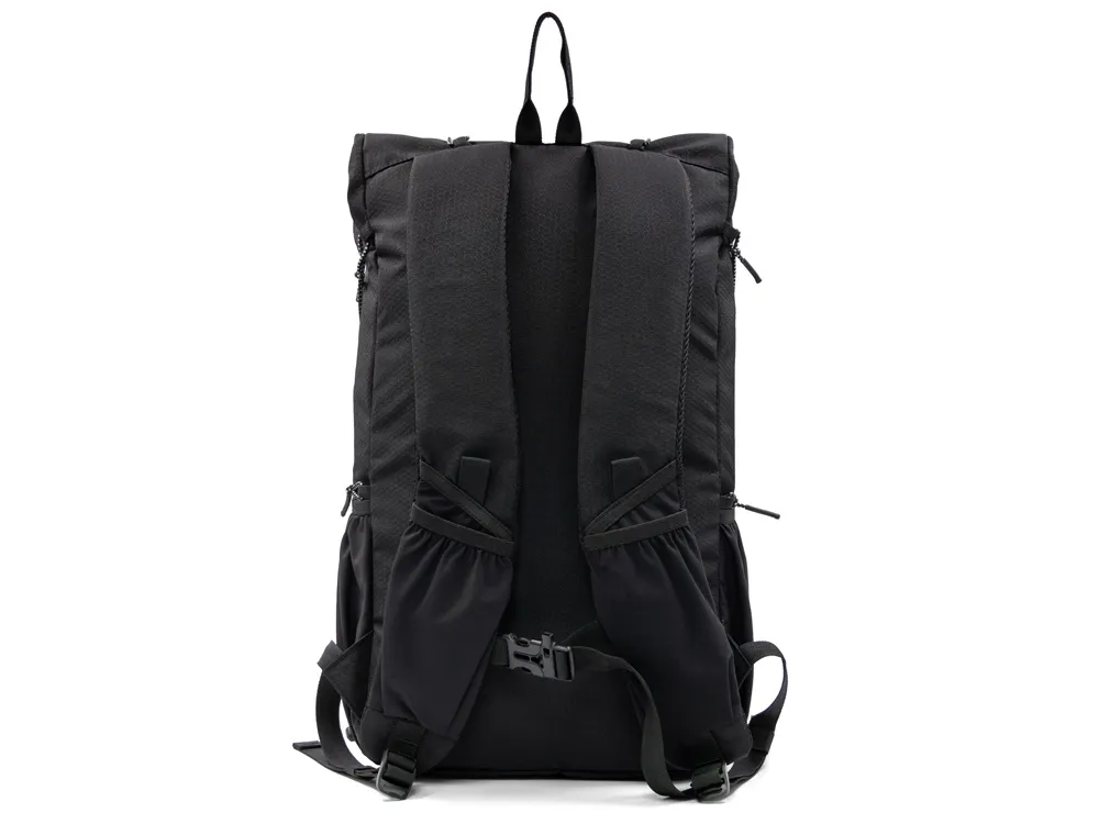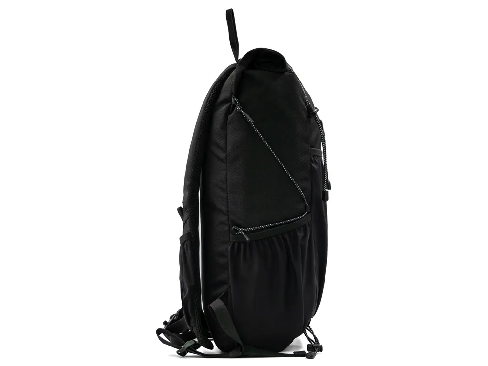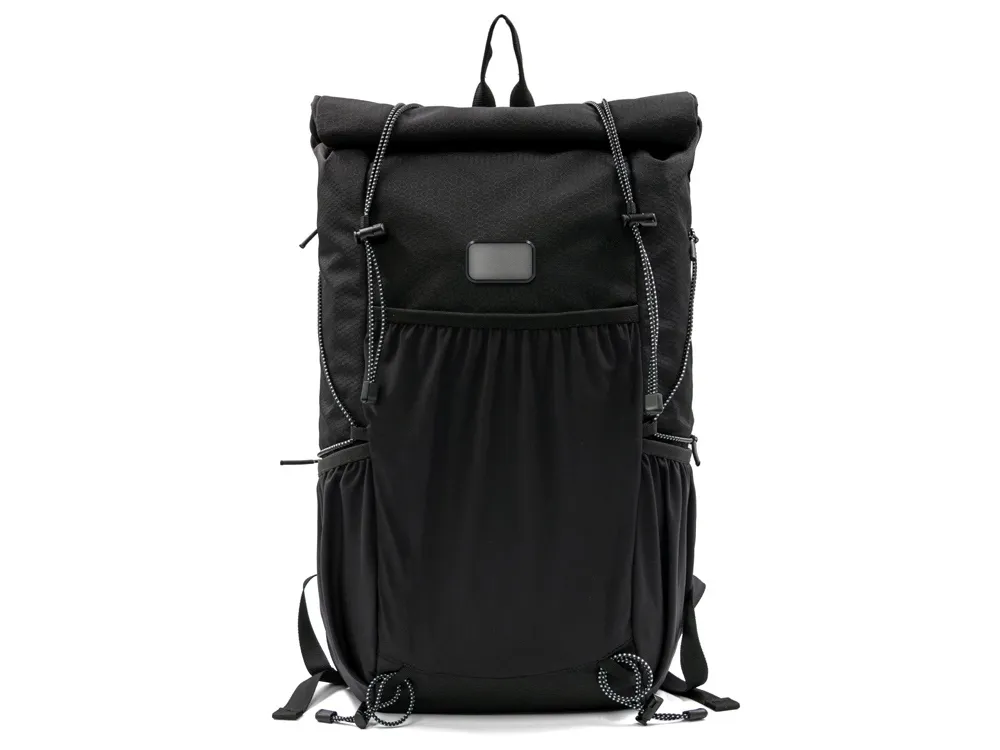 Легкий, элегантный, складывающийся рюкзак вместителен и удобен благодаря системе закрытия основного отделения roll-top, наличию трех наружных карманов спереди и по бокам из прочной эластичной сетки и внутреннему плотному карману для ноутбука до 16". Лямки с эластичными карманами для карт, телефона и других мелочей фиксируются на груди пряжкой, которую можно отрегулировать по высоте под ваш рост. Эластичные фиксирующие шнурки имеют светоотражающее нанесение, что обеспечивает дополнительную защиту в темное время суток. Дышащая сетка на спинке обеспечивает удобство и комфорт. На нагрудной пряжке предусмотрен свисток для экстренного случая. Водостойкая ткань верха изготовлена из переработанного пластика, пропитана специальным составом против загрязнения. В комплекте металлический шильд для нанесения вашего логотипа.