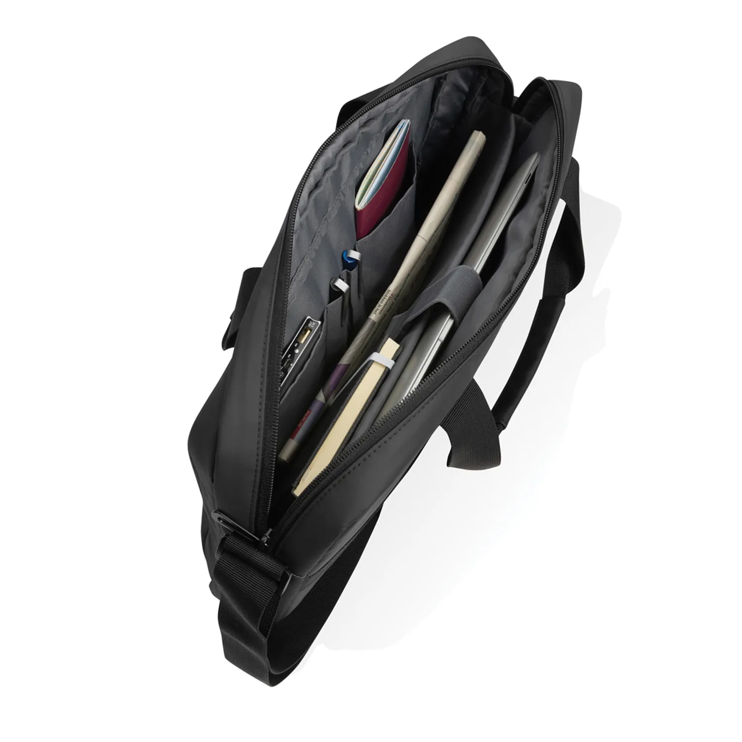 Сумка для ноутбука 15,6’’ — незаменимая вещь в современном мире, работаете ли вы в офисе или на фрилансе. С ней можно отправиться в поездку, командировку или путешествие и не беспокоиться о безопасности ноутбука. Сумка из серии Armond — это классический дизайн и функциональность. Помимо отделения для ноутбука с мягкой подкладкой и фиксатором в ней есть отсек для ежедневника, документов, зарядных устройств и других вещей, которые пригодятся в дороге или на работе. Она укомплектована съемным плечевым ремнем и багажной лентой для удобства в путешествиях. Сумка изготовлена из переработанных пластиковых бутылок. Сертифицировано AWARE™. Наличие индикаторных частиц AWARE™ подтверждает, что мы действительно используем переработанные материалы. 2% с продажи каждой вещи, отмеченной сертификатом AWARE™, мы перечисляем в поддержку всемирной организации Water.org.