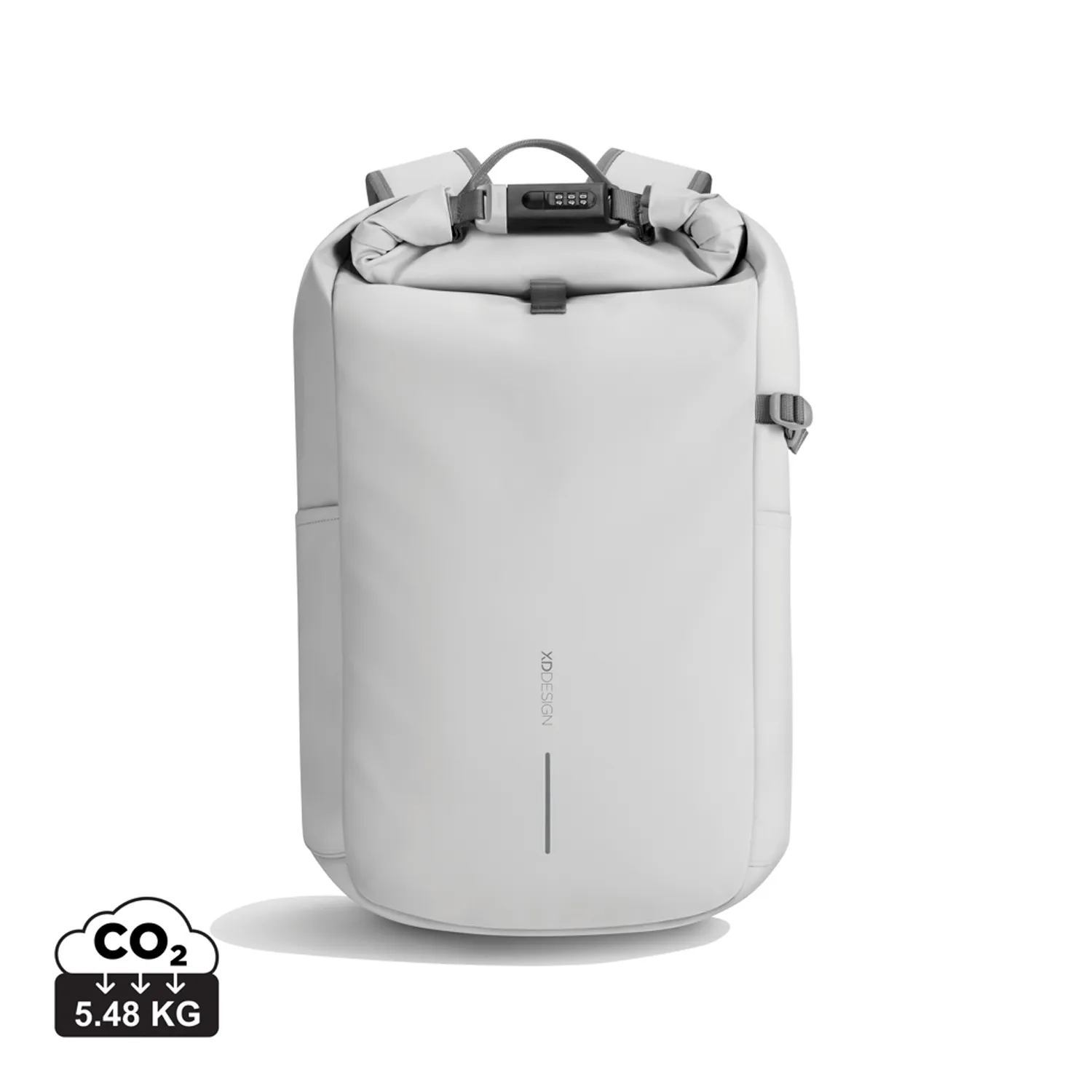 Антикражный рюкзак Urban Roll-top станет идеальным спутником в путешествиях и поездках. Помимо безопасности он гарантирует удобство и комфорт в любых ситуациях. Внутри рюкзака одно большое отделение с сетчатыми кармашками для организации вещей. Со стороны спинки есть мягкий отсек для ноутбука диагональю до 16’’. Снаружи располагаются три кармана: один из них — на спинке — для документов, телефона и других ценных вещей. Есть и два боковых кармана, один из которых нужен для бутылки с водой — ее можно дополнительно зафиксировать с помощью ремешка. Основная фишка Urban — сворачивающаяся верхняя часть. Сложите внутрь все необходимое, застегните молнию, а затем сверните верхнюю часть рулончиком и закрепите усиленными кодовым замком, открыть который сможет только хозяин. Для большего удобства в путешествиях на спинке есть багажный ремень для ручки чемодана. Прочный и стильный рюкзак изготовлен из переработанных пластиковых бутылок и полиуретана. Эти материалы отличаются водоотталкивающими свойствами — это значит, что ваши вещи останутся сухими во время дождя и снега. Общий объем рюкзака — 26 литров. Сертифицировано AWARE™. Наличие индикаторных частиц AWARE™ подтверждает, что мы действительно используем переработанные материалы. 2% с продажи каждой вещи, отмеченной сертификатом AWARE™, мы перечисляем в поддержку всемирной организации Water.org. Зарегистрированный дизайн®