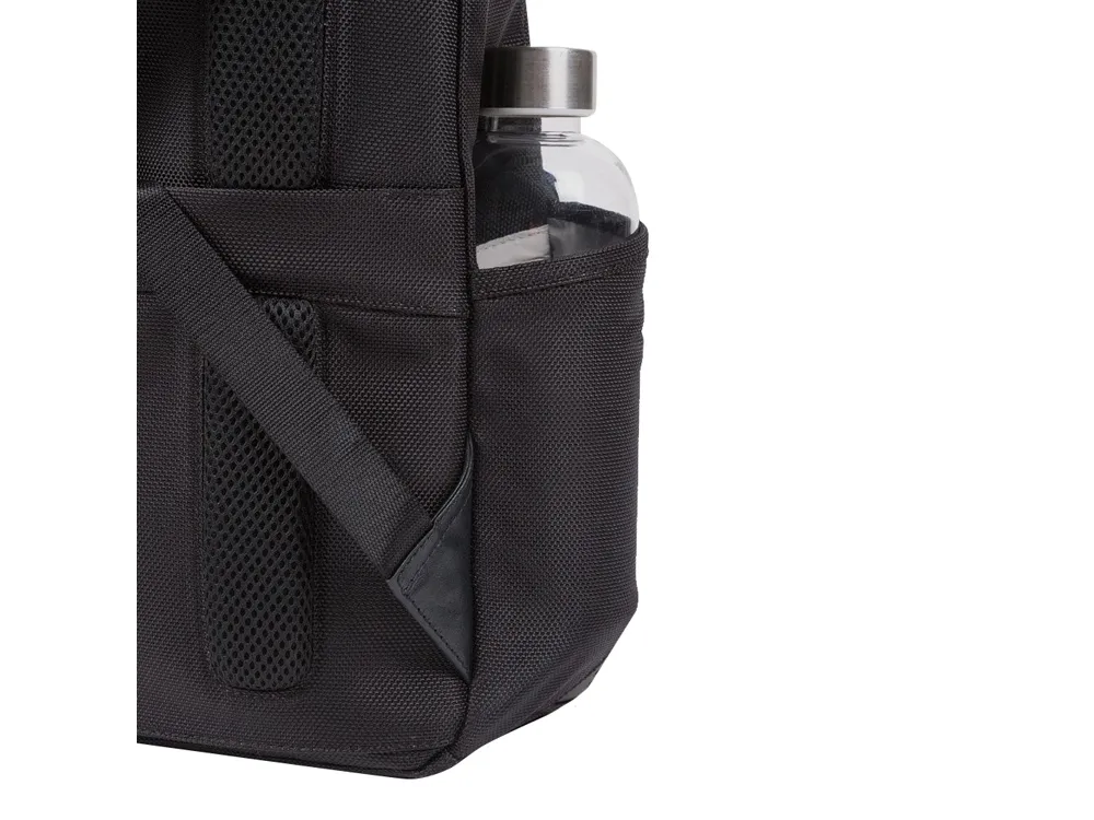 Рюкзак из переработанного текстиля с отделениями для ноутбука и iPad® и карманами для зонта и бутылки - мягкое отделение для ноутбука 14" - отделение для iPad® 10,2'', iPad® Air 10,9'', iPad®Pro 11'' - внутренний карман для мобильного телефона - карман для AirPods® - внешний держатель для бутылки - отстегиваемая адресная бирка - карман для зонта - складной карман для бутылки - петлая для ручки - ремень для крепления на ручке чемодана