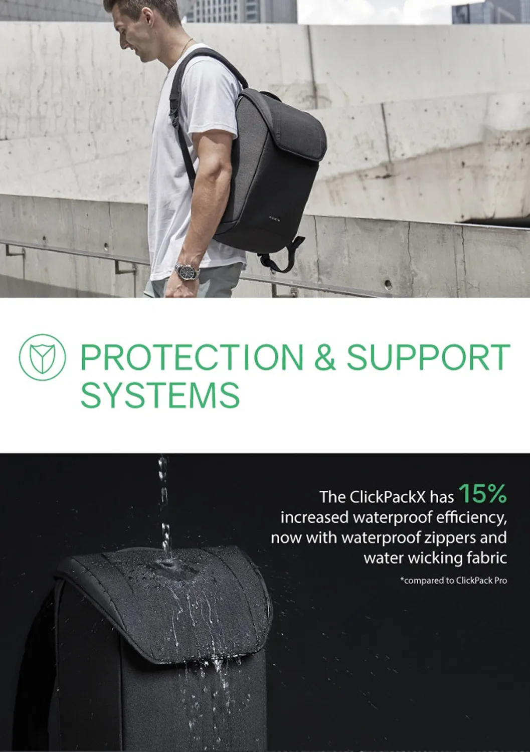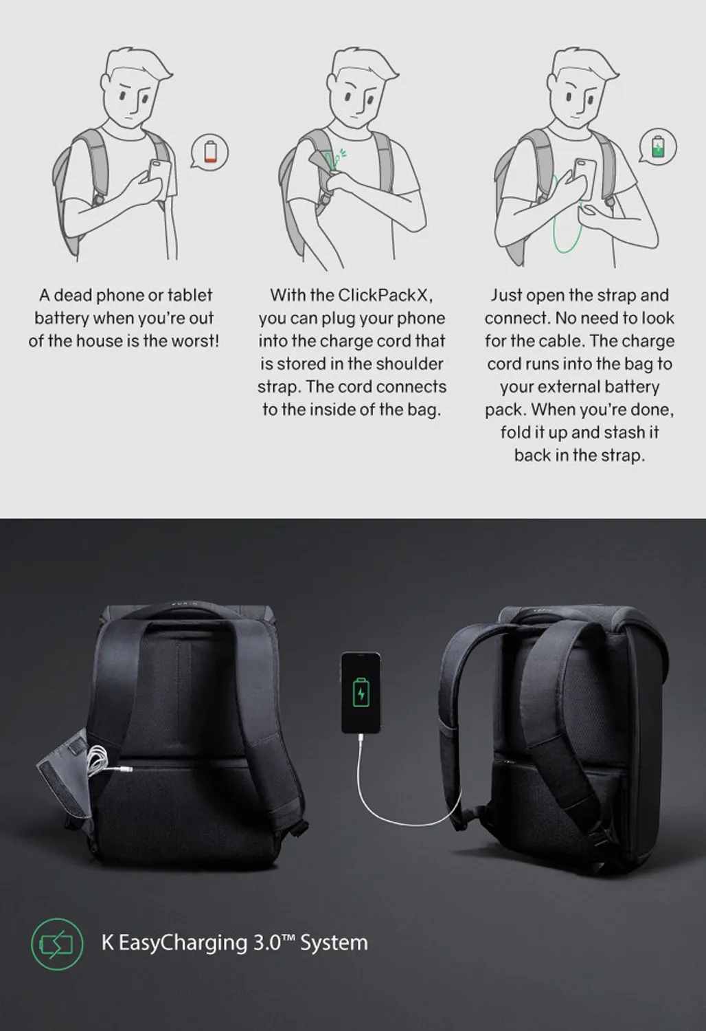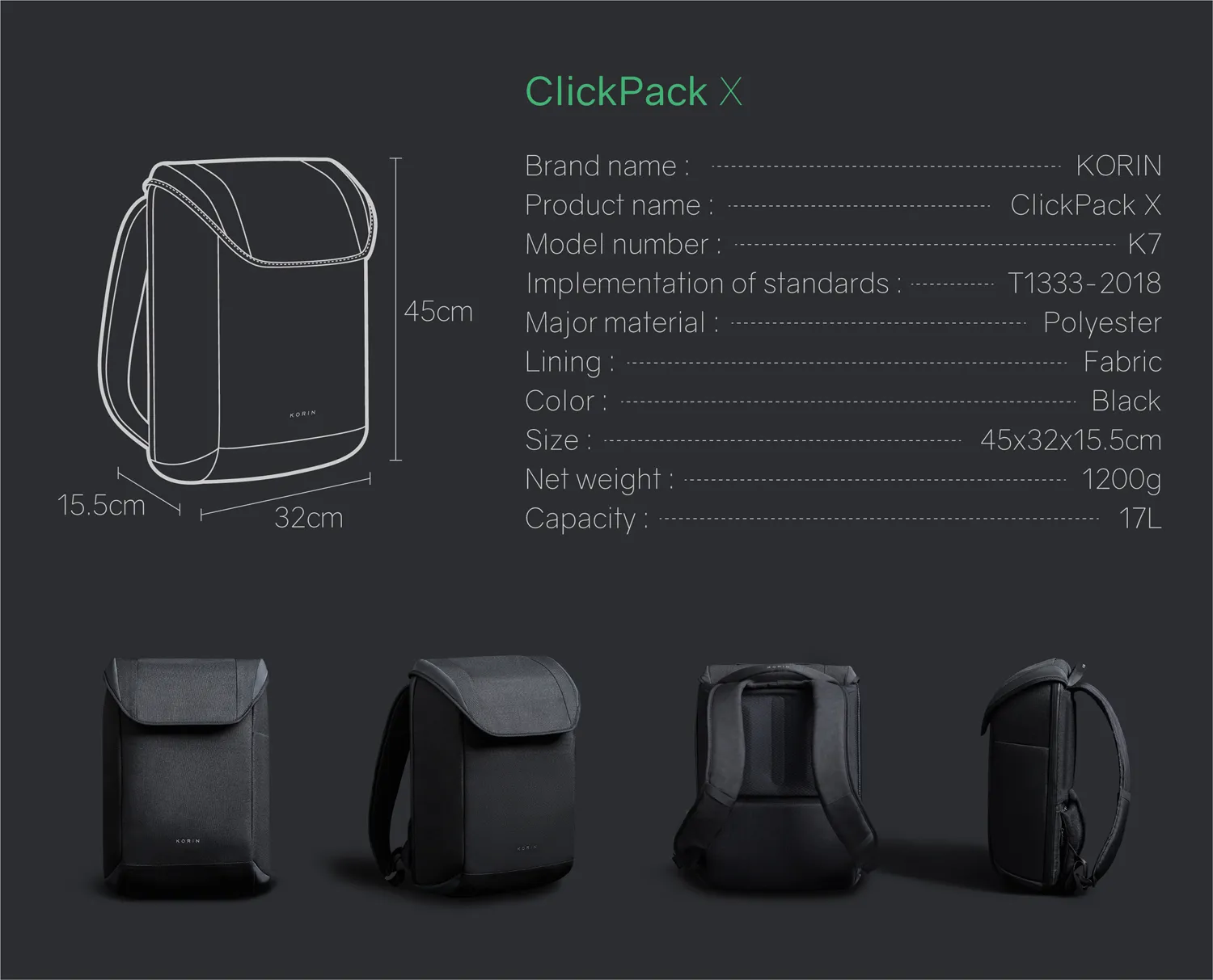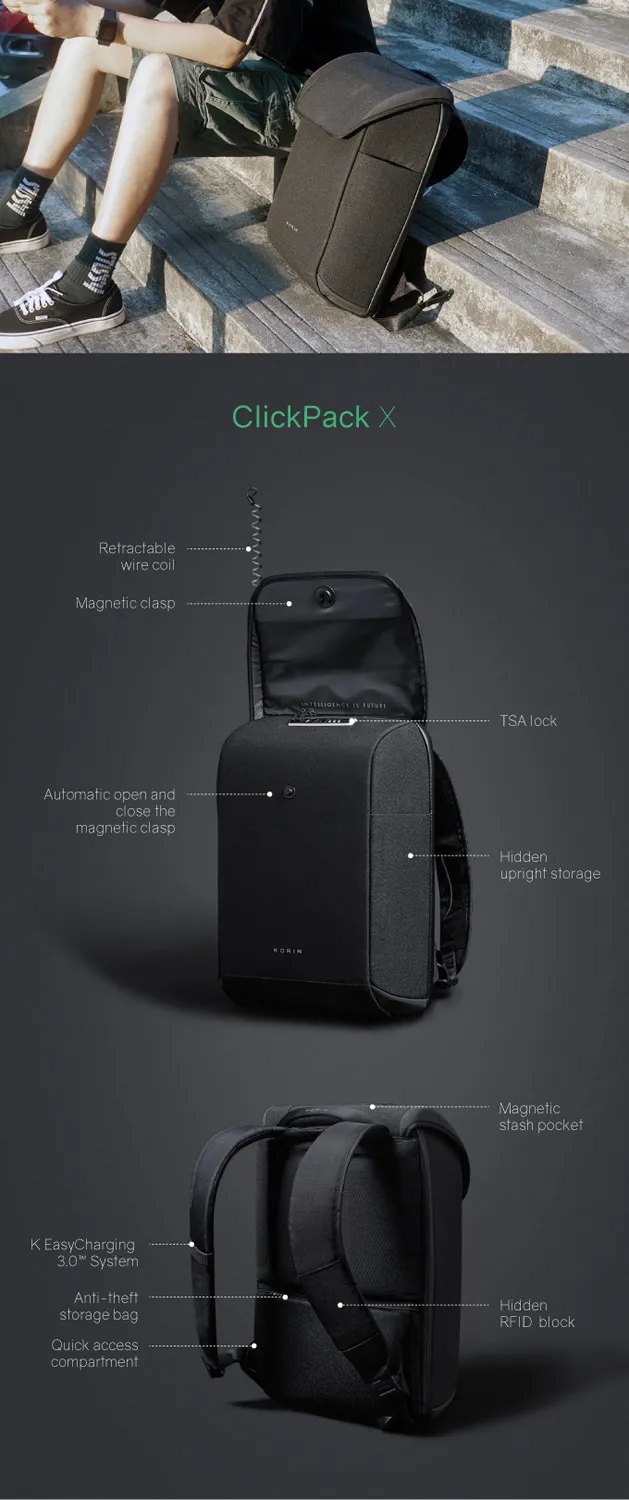 Вместительный городской рюкзак ClickPack X черного цвета, обладатель премии iF Design Award 2020. Сделан из свехпрочного устойчивого к порезам и трению водоотталкивающего полиэстера многослойного плетения. Сочетание полиэстера и стекловолокна защищает от порезов ножом или другими острыми предметами. Конструкция достаточно жесткая, не деформируется. Детально продуманная организация отделений позволяет грамотно распределить вес. Самые тяжелые предметы располагаются ближе к спине. Благодаря плотным перегородкам ноутбук надежно фиксируется и не перемещается при ходьбе. Специальная анатомическая конструкция снижает нагрузку на плечи и спину, и вес рюкзака воспринимается на 20-25% легче, чем при использовании стандартных моделей рюкзаков. Если необходимо достать какие-то мелочи, достаточно зафиксировать липучки для вертикального открытия на 30°, а для того, чтобы аккуратно уложить в рюкзак много различных предметов, просто положите его и раскройте на 180°. Дополнительно в основном отделении расположены еще 5 карманов различного функционала, в один из которых размером 16х10 см можно поместить powerbank, т к в него приходит USB-кабель, соединенный с портом на внешней стороне рюкзака для легкого подключения к смартфону. Это оригинальная запатентованная система зарядки K EasyCharging 3.0 нового поколения с помощью USB-порта, расположенного в лямке рюкзака, и кабеля, идущего к powerbank, что делает мобильную зарядку более удобной. • Размер 45х32х15,5 см • Объем 18 л • Вес 1200 гр Ключевые моменты: • Отделение 34х28х3 см для ноутбука диагональю до 15,6” • Дополнительный карман 18х24 см для планшета диагональю до 8” или мелких вещей. • Вентилируемая спинка с мягкими анатомическими вставками и защитой поясничного отдела позвоночника. • Конструкция позволяет открывать рюкзак под углом 30° или распахнуть полностью на 180°. • Водонепроницаемая молния YKK, с фиксацией кодового замка TSA007 с функцией таможенного досмотра. • Клапан с магнитным замком с системой SNAP. • Оснащен стальным тросом который можно зафиксировать бегунком молнии в кодовом замке Внутреннее наполнение: • 5 карманов различного функционала. • 1 карман размерами 13х22 см и 14х22 см на молнии • 1 карман размерами 114х22 см на молнии • 3 открытых кармана под мелочи Внешняя сторона: • Водозащищенный карман 14х11 см. • USB-порт на правой лямке • easy access карман для карточек на левой лямке • Петельки для очков или проводных наушников на лямках • Потайной карман на магнитной застежке на спинке - 14х28 см. • Дополнительная лямка, за которую можно закрепить рюкзак на выдвижной ручке чемодана. • Треугольные светоотражающие элементы черного цвета на углах
