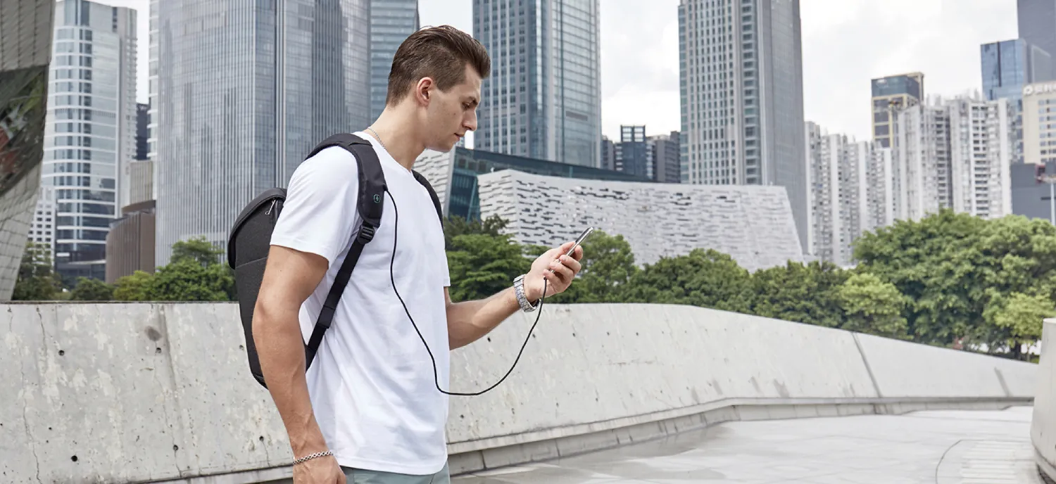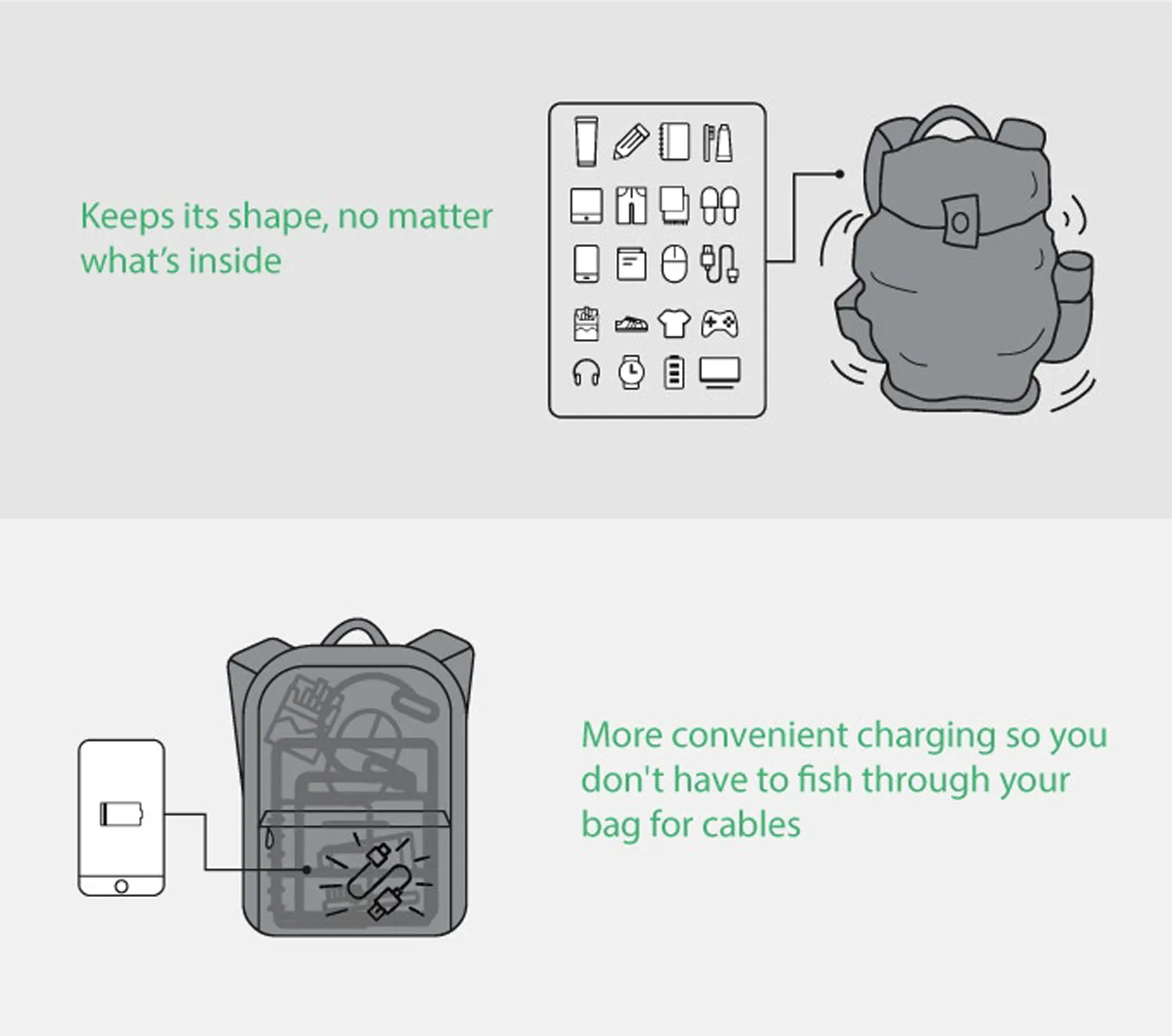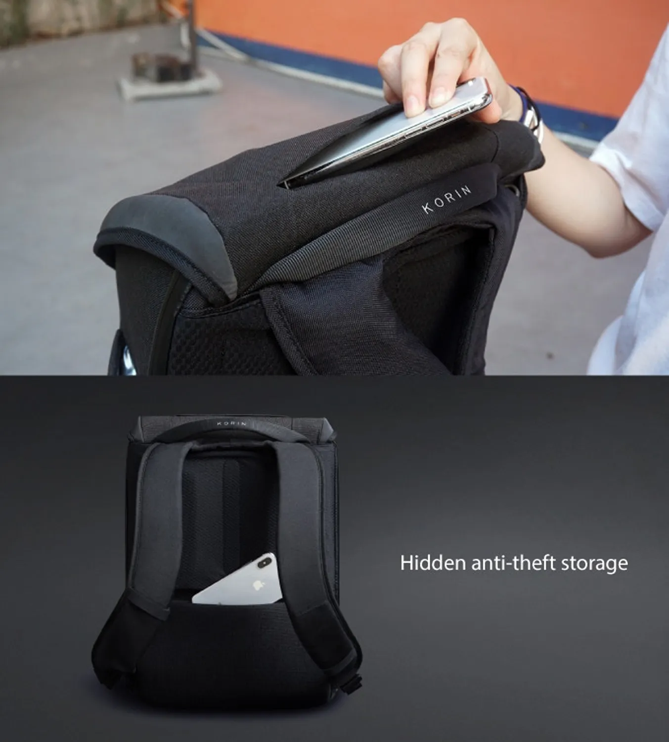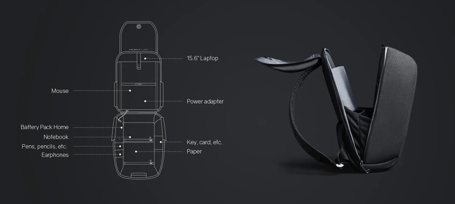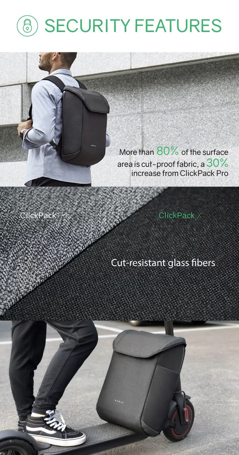 Вместительный городской рюкзак ClickPack X черного цвета, обладатель премии iF Design Award 2020. Сделан из свехпрочного устойчивого к порезам и трению водоотталкивающего полиэстера многослойного плетения. Сочетание полиэстера и стекловолокна защищает от порезов ножом или другими острыми предметами. Конструкция достаточно жесткая, не деформируется. Детально продуманная организация отделений позволяет грамотно распределить вес. Самые тяжелые предметы располагаются ближе к спине. Благодаря плотным перегородкам ноутбук надежно фиксируется и не перемещается при ходьбе. Специальная анатомическая конструкция снижает нагрузку на плечи и спину, и вес рюкзака воспринимается на 20-25% легче, чем при использовании стандартных моделей рюкзаков. Если необходимо достать какие-то мелочи, достаточно зафиксировать липучки для вертикального открытия на 30°, а для того, чтобы аккуратно уложить в рюкзак много различных предметов, просто положите его и раскройте на 180°. Дополнительно в основном отделении расположены еще 5 карманов различного функционала, в один из которых размером 16х10 см можно поместить powerbank, т к в него приходит USB-кабель, соединенный с портом на внешней стороне рюкзака для легкого подключения к смартфону. Это оригинальная запатентованная система зарядки K EasyCharging 3.0 нового поколения с помощью USB-порта, расположенного в лямке рюкзака, и кабеля, идущего к powerbank, что делает мобильную зарядку более удобной. • Размер 45х32х15,5 см • Объем 18 л • Вес 1200 гр Ключевые моменты: • Отделение 34х28х3 см для ноутбука диагональю до 15,6” • Дополнительный карман 18х24 см для планшета диагональю до 8” или мелких вещей. • Вентилируемая спинка с мягкими анатомическими вставками и защитой поясничного отдела позвоночника. • Конструкция позволяет открывать рюкзак под углом 30° или распахнуть полностью на 180°. • Водонепроницаемая молния YKK, с фиксацией кодового замка TSA007 с функцией таможенного досмотра. • Клапан с магнитным замком с системой SNAP. • Оснащен стальным тросом который можно зафиксировать бегунком молнии в кодовом замке Внутреннее наполнение: • 5 карманов различного функционала. • 1 карман размерами 13х22 см и 14х22 см на молнии • 1 карман размерами 114х22 см на молнии • 3 открытых кармана под мелочи Внешняя сторона: • Водозащищенный карман 14х11 см. • USB-порт на правой лямке • easy access карман для карточек на левой лямке • Петельки для очков или проводных наушников на лямках • Потайной карман на магнитной застежке на спинке - 14х28 см. • Дополнительная лямка, за которую можно закрепить рюкзак на выдвижной ручке чемодана. • Треугольные светоотражающие элементы черного цвета на углах