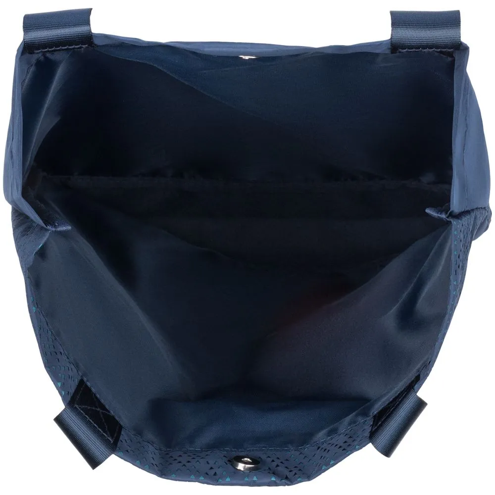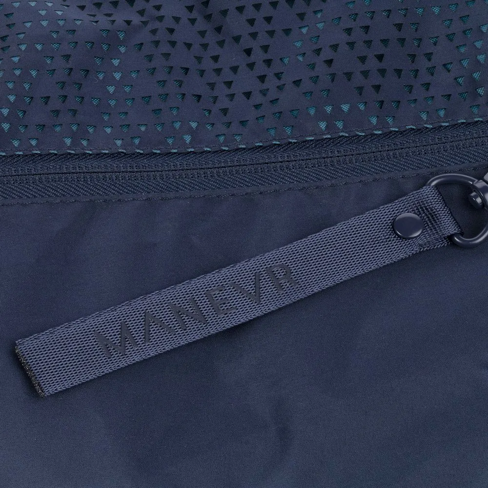 Цвет Outer Space лег в основу коллекции сумок Triangel, позволяя создать модное монохромное сочетание с изделиями Manevr темно-синего цвета. Изделия изготовлены из шелковистого полиэстера, в отделке использована лазерная перфорация паттерна.