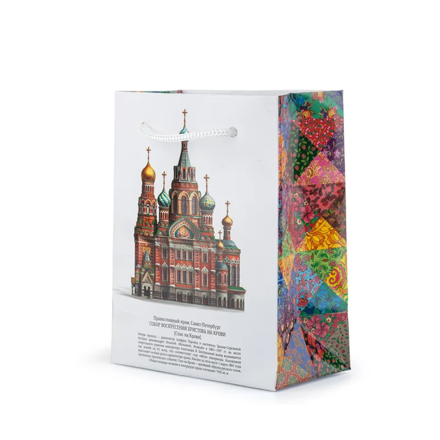Пакет маленький Сугревъ с изображением собора "Спаса на Крови" Подарочный прочный ламинированный пакет с люверсами и плетёными верёвочными ручками из толстого шнура. Пакет снабжён авторской иллюстрацией и описанием истории собора Спаса на Крови на русском и английском языках и в этом смысле не имеет аналогов. Боковины пакета декорированы эффектным узором в стиле пэчворк, напоминающим лоскутное одеяло. Размер пакета позволяет положить в него одну или две маленькие упаковки чая. Это идеальное решение для ситуации, когда вам необходимо сделать много эффектных, но недорогих подарков. Размер: 14 х 11 х 6 см