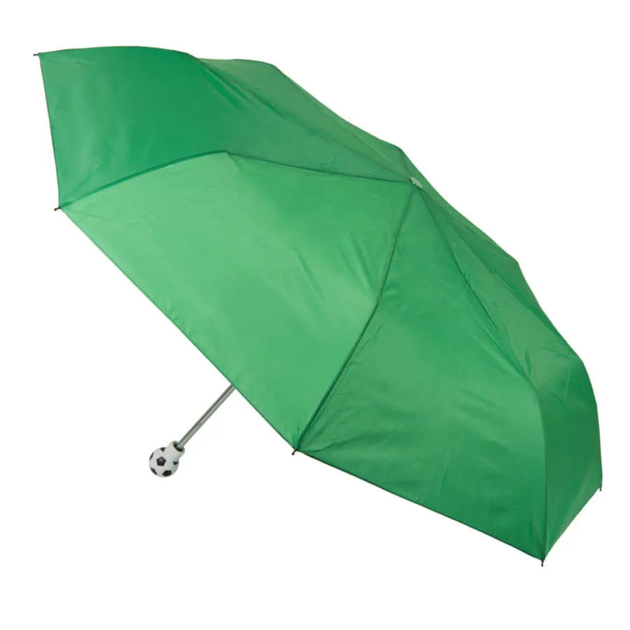 Зонт складной, 3 сложения, механический.Диаметр купола: 105 см., длина в сложенном состоянии 27 см.Состав купола: 100% полиэстер 190T.Состав стержня: металл.Состав спиц: металл + стекловолокно.Ручка: пластик в виде футбольного мяча.Цвет купола: близкий к пантону 348C. Зонт упаковывается в футляр из основного материала.(при желании футляр можно убрать в ручку зонта).
