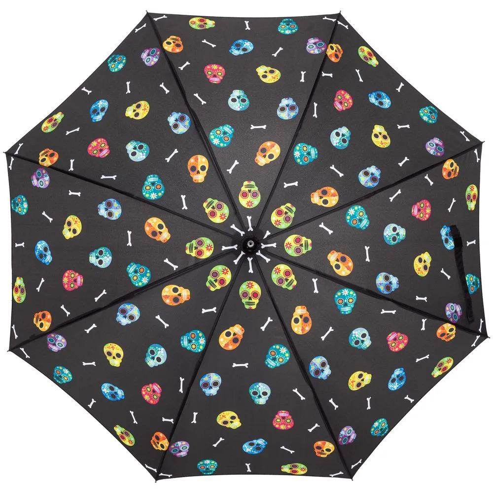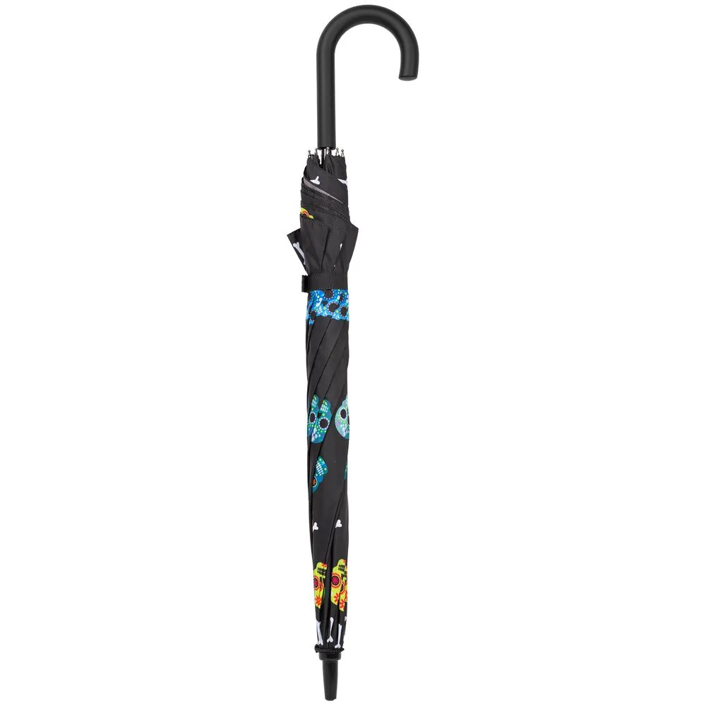Зонт-трость с веселыми черепами-калаверами — символом мексиканского Дня мертвых — наполнит ваши прогулки под пасмурным небом атмосферой ярчайшего латиноамериканского фестиваля. Дождю не испортить ваш внутренний праздник!Зонт-полуавтомат, 8 спиц.