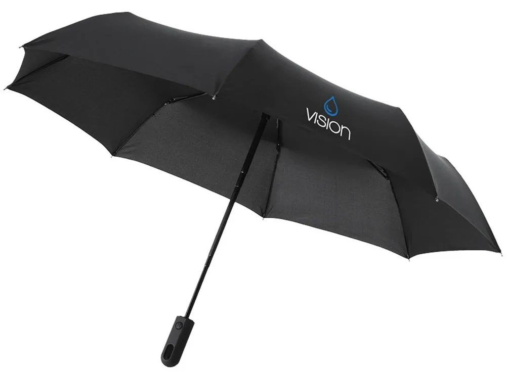 Эксклюзивный автоматически открывающийся и закрывающийся зонт в три сложения. Черная металлическая трость, стекловолоконные спицы и пластиковая прорезиненная ручка. Предлагается в чехле под цвет зонта. Длина зонта в сложенном виде: 31 см. Эпонж полиэстер.