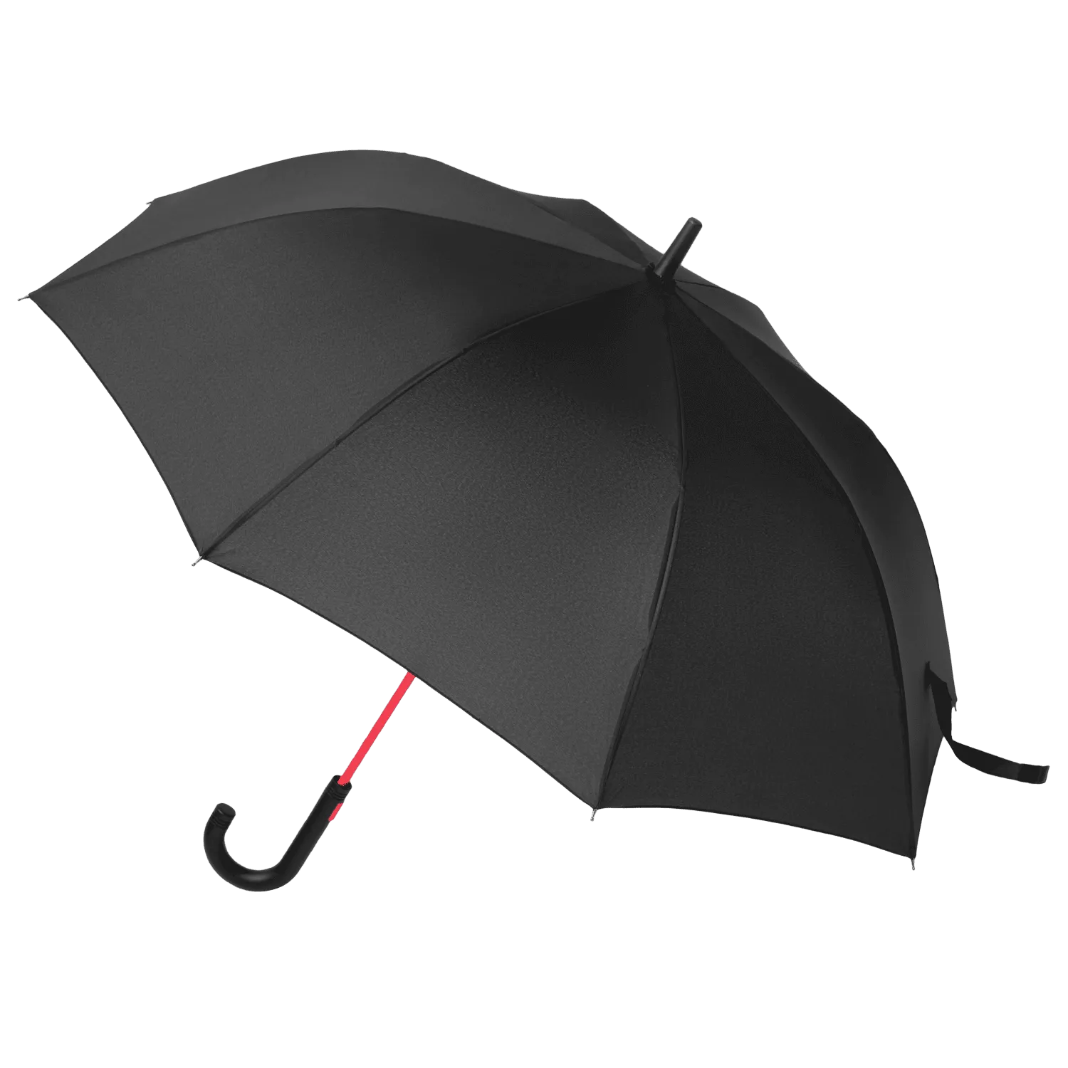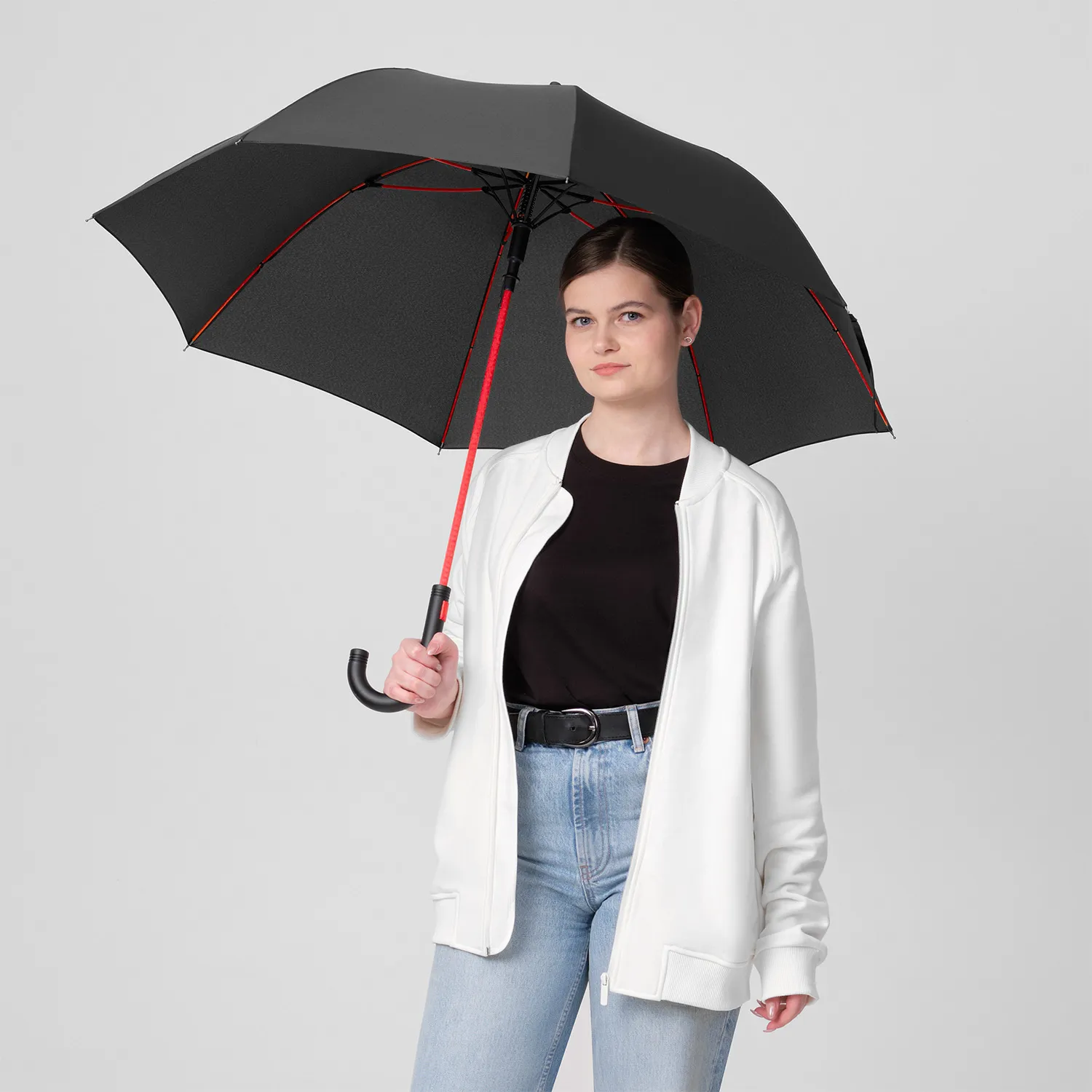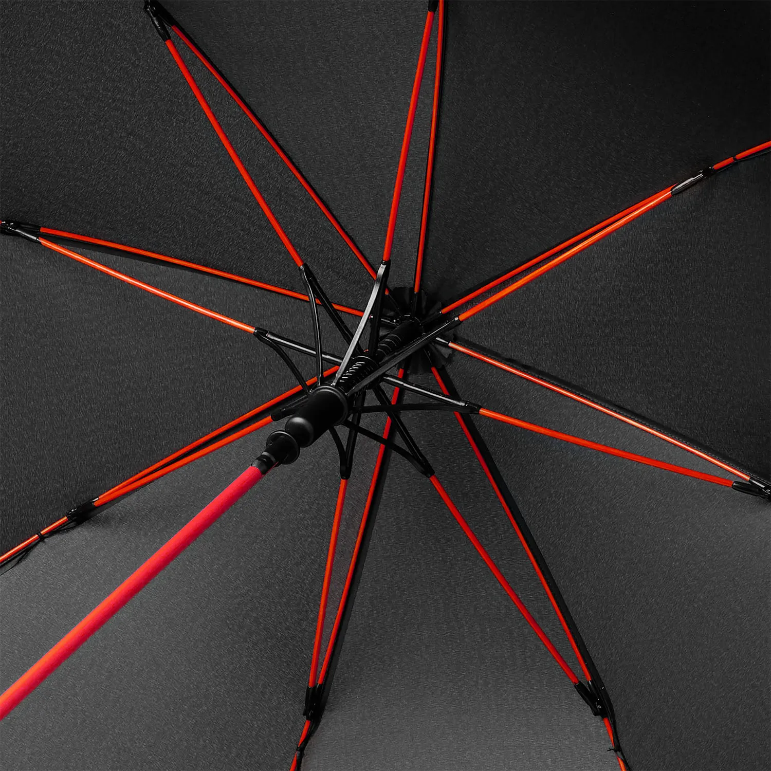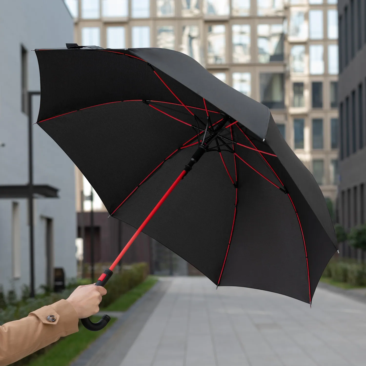 Полуавтоматический зонт быстро раскрывается при нажатии на кнопку. Контрастные цветные спицы окрашены в тон трости и кнопки на ручке. Зонт оснащен гибкими спицами с конструкцией антиветер, которая защищает зонт от поломок при резких порывах ветра. PU-покрытие на ручке зонта обеспечивает комфортное и долговечное использование аксессуара: оно устойчиво к истиранию, не скользит в руке и не становится липким.